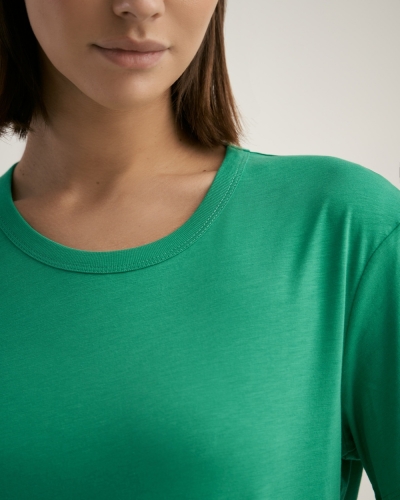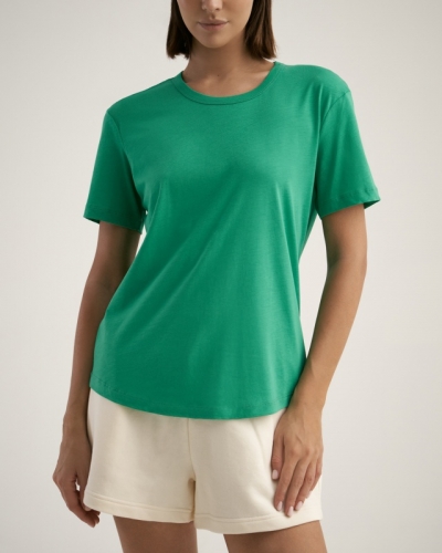 БАМБУК 50%; ХЛОПОК 50%Женская футболка полуприлегающего силуэта с фигурным низом. Горловина окантована.