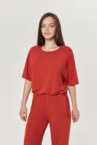 ВИСКОЗА 95%; ЭЛАСТАН 5%Футболка женская. Горловина окантована бейкой из основной ткани. Втачной рукав. По низу кулиска со шнурком. В левом боковом шве разрез