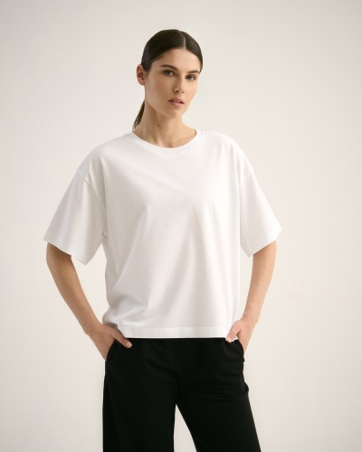 ХЛОПОК 100%Укороченная футболка/ спущенное плечо.Укрепление плечевых швов и шва горловины бейкой из основной ткани. Горловина из рибаны.