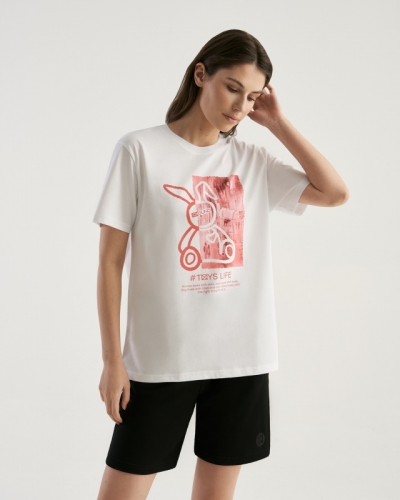 ХЛОПОК 100%Boyfriend крой/ укрепление по горловине спинки/ круглый вырез. Горловина рибана. Отстрочка по горловине переда. Текст принта: "Woman loves with ears/ man loves with eyes / dog loves with nose and only rabbit loves with the right thing to do it"-"Женщина любит ушами/ мужчина любит глазами/ собака любит носом/ и только кролик любит правильно"