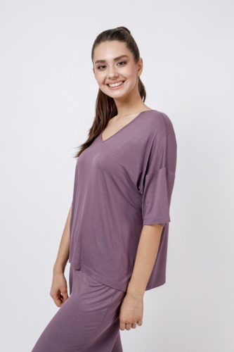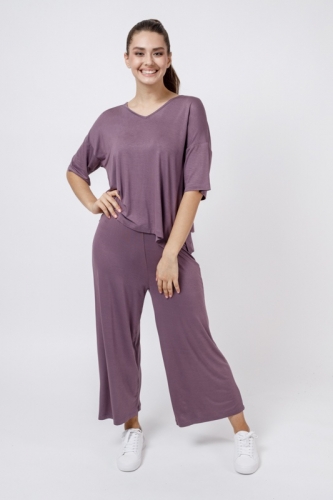 ВИСКОЗА 95%; ЭЛАСТАН 5%Футболка свободного кроя/ спущенное плечо/ короткий рукав/ в боковых швах обработаны разрезы. V-вырез. Брюки свободного кроя/ длина семь восьмых