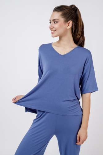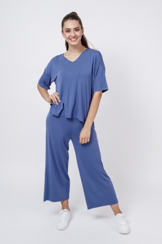 ВИСКОЗА 95%; ЭЛАСТАН 5%Футболка свободного кроя/ спущенное плечо/ короткий рукав/ в боковых швах обработаны разрезы. V-вырез. Брюки свободного кроя/ длина семь восьмых