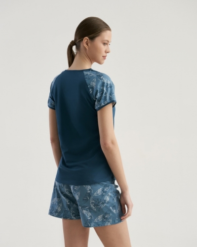 ХЛОПОК 92%; ЭЛАСТАН 8%Футболка рукав реглан/ по линии реглана/ на полочке вставлен кант из отделочной ткани. Горловина и нижний срез рукава обработаны трикотажной лентой из однотонной ткани. Короткие шорты свободного кроя/ отстроченный пояс.
