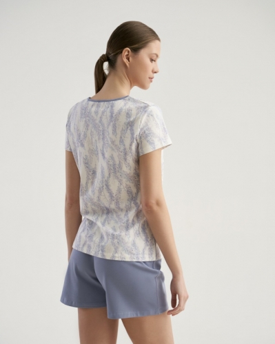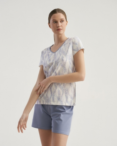 ХЛОПОК 92%; ЭЛАСТАН 8%Классическая футболка/ полуприлегающего силуэта/ короткий рукав/ с горловиной V вырезом. Укороченные шорты свободного кроя/ отстроченный пояс
