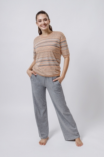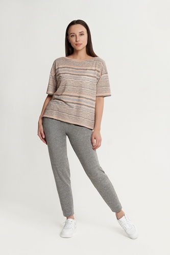 МОДАЛ 50%; ХЛОПОК 36%; ПОЛИЭСТЕР 14%Футболка свободного кроя/ спущенное плечо/ короткий рукав/ О-вырез. В боковых швах обработаны разрезы. Горловина обработана подвязом. Брюки зауженные к низу/ боковой карман/ глубокая склада.