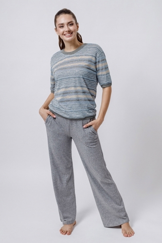 МОДАЛ 50%; ХЛОПОК 36%; ПОЛИЭСТЕР 14%Футболка свободного кроя/ втачной рукав. Длина рукава до локтя/ О-вырез. Горловина/ низ рукавов/ низ изделия обработан подвязом. Прямые брюки/ карман в боковом шве.