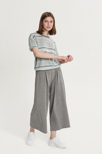 МОДАЛ 50%; ХЛОПОК 36%; ПОЛИЭСТЕР 14%Футболка свободного кроя спущенное плечо/ короткий рукав. О-вырез. Горловина/ низ изделия обработаны подвязом. Юбка-брюки/ длиной семь восьмых. Боковой карман/ глубокая складка.