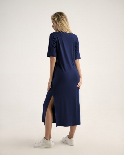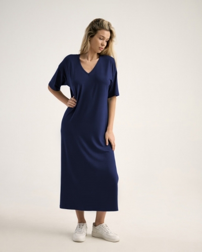ВИСКОЗА 92%; ЭЛАСТАН 8%Платье/ длина макси с высоким разрезом в левом боковом шве. Спущенное плечо.Втачной короткий рукав. V- вырез.Горловина окантована бейкой из основной ткани.