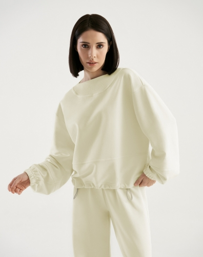 ХЛОПОК 87%; ПОЛИЭСТЕР 13%Свитшот с отрезной линией по переду и по рукаву. Втачной рукав. Фигурная горловина из рибаны. Низ свитшота на кулиске с фиксаторами для резинки. По низу рукава резинка.