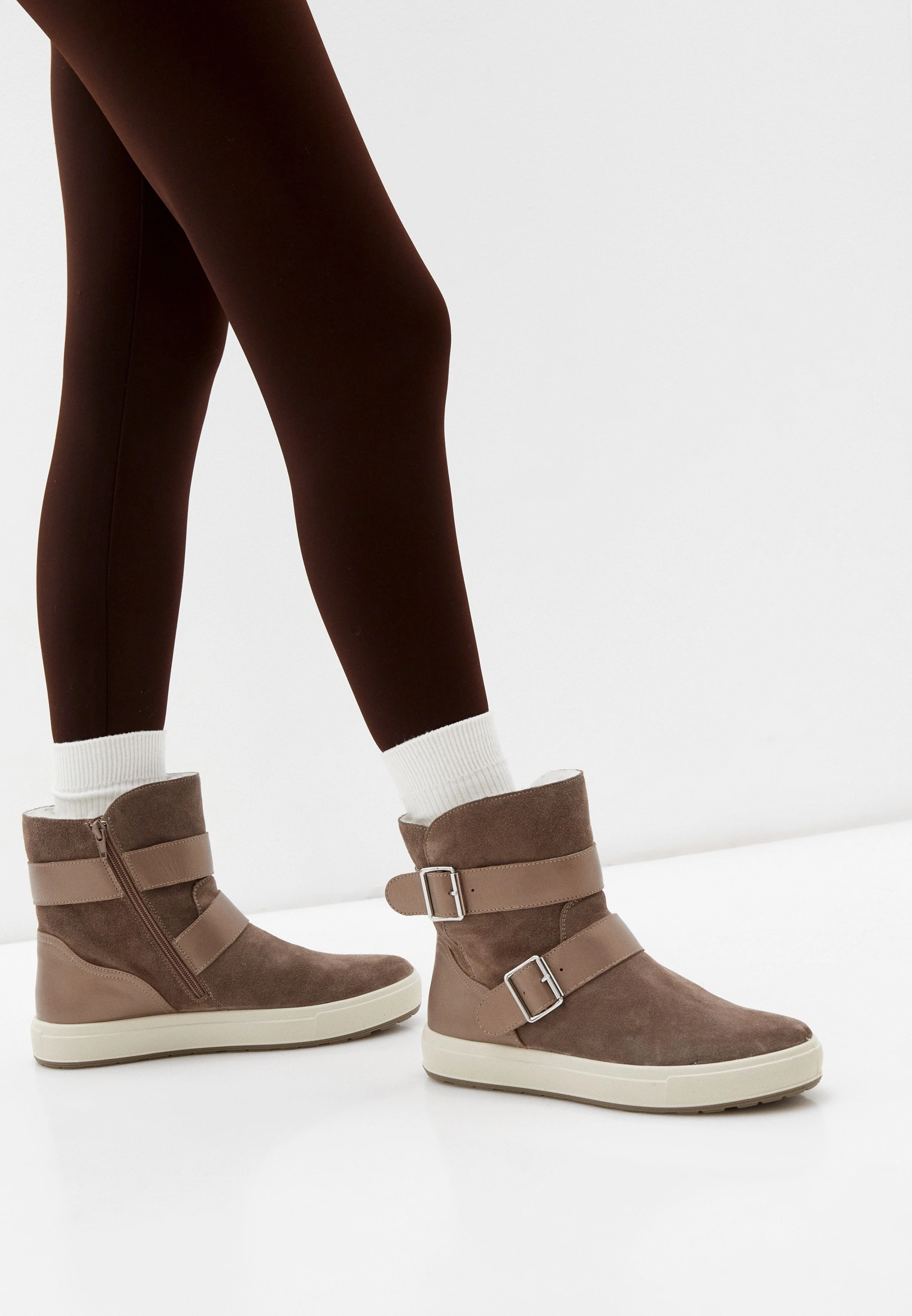 Светло-коричневые полусапоги SHEILA — удачное решение для прохладной погоды: подкладка из густой овчины хорошо сохраняет тепло, а широкая подошва защитит ноги от луж. Модель выполнена из мягкой бархатистой замши и декорирована широкими ремешками.