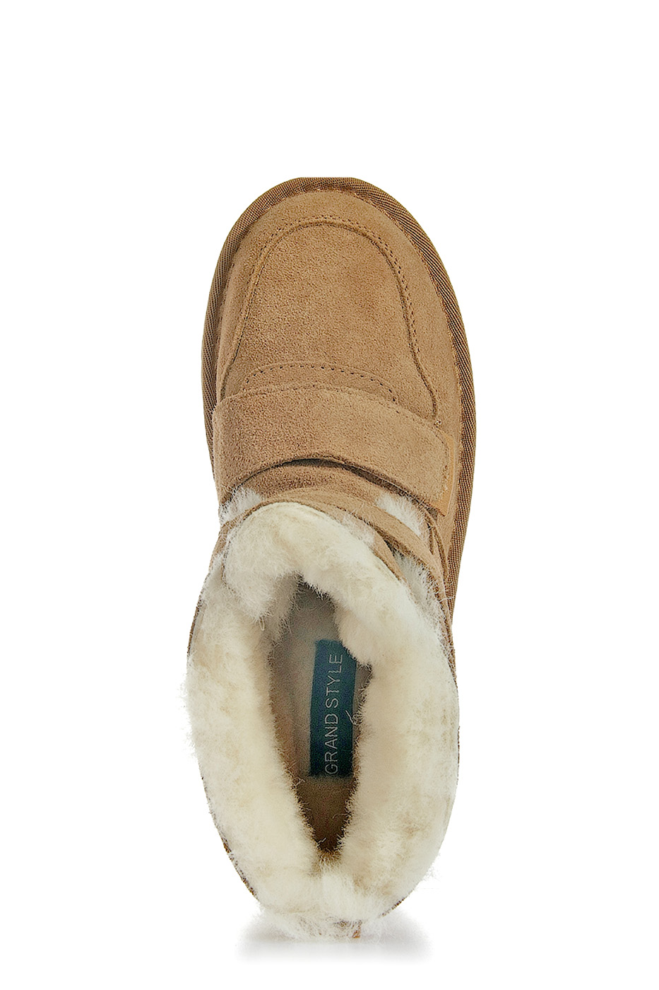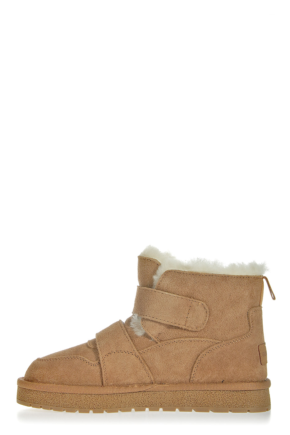 Унты выполнены из натуральной замши, верх оформлен объемными швами. Задник укреплен вставкой и дополнен логотипом бренда. Внутренняя отделка из натуральной шерсти.