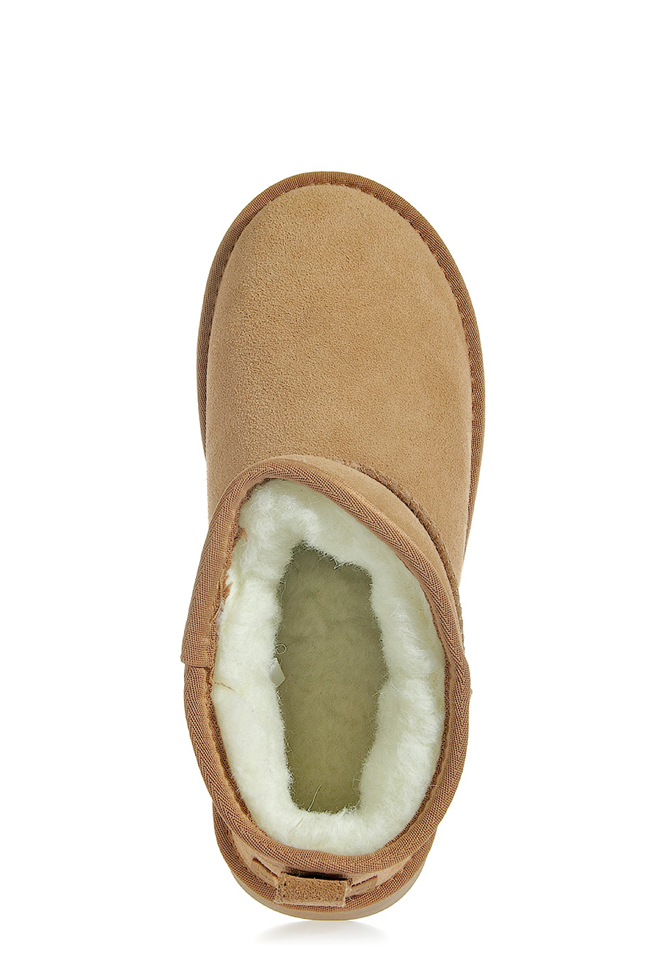 Унты выполнены из натуральной замши, верх оформлен объемными швами. Задник укреплен вставкой и дополнен логотипом бренда. Внутренняя отделка из натуральной шерсти.