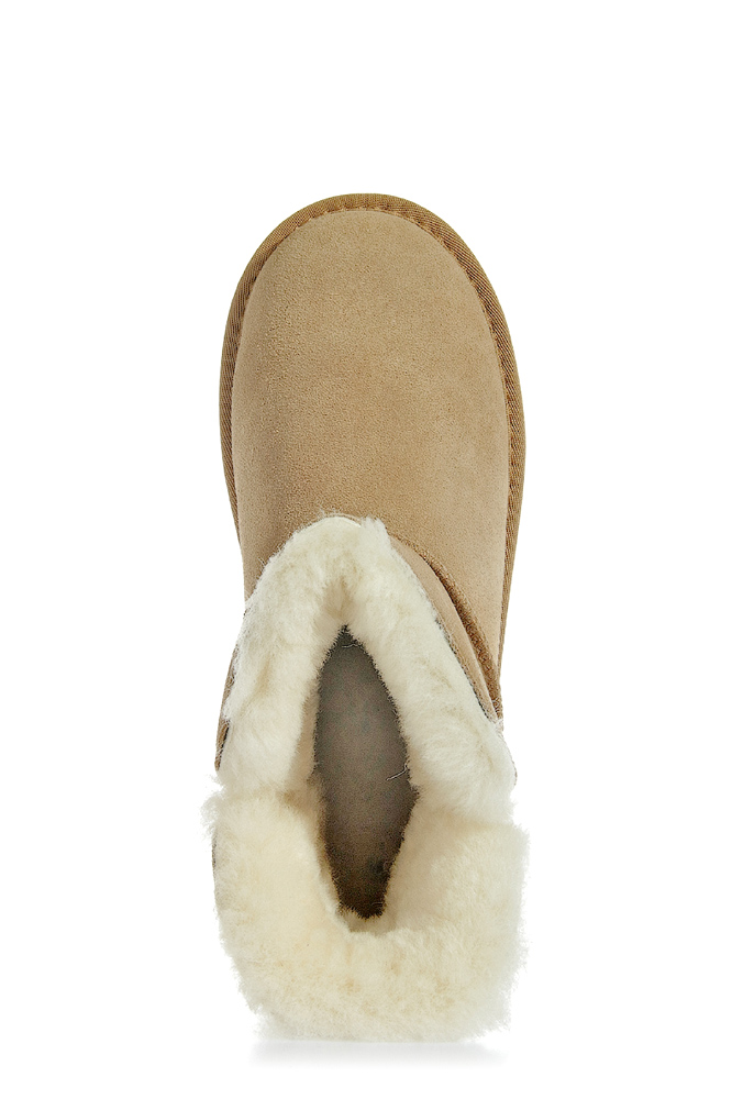 Унты выполнены из натуральной замши, верх оформлен объемными швами. Задник укреплен вставкой и дополнен логотипом бренда. Внутренняя отделка из натуральной шерсти.