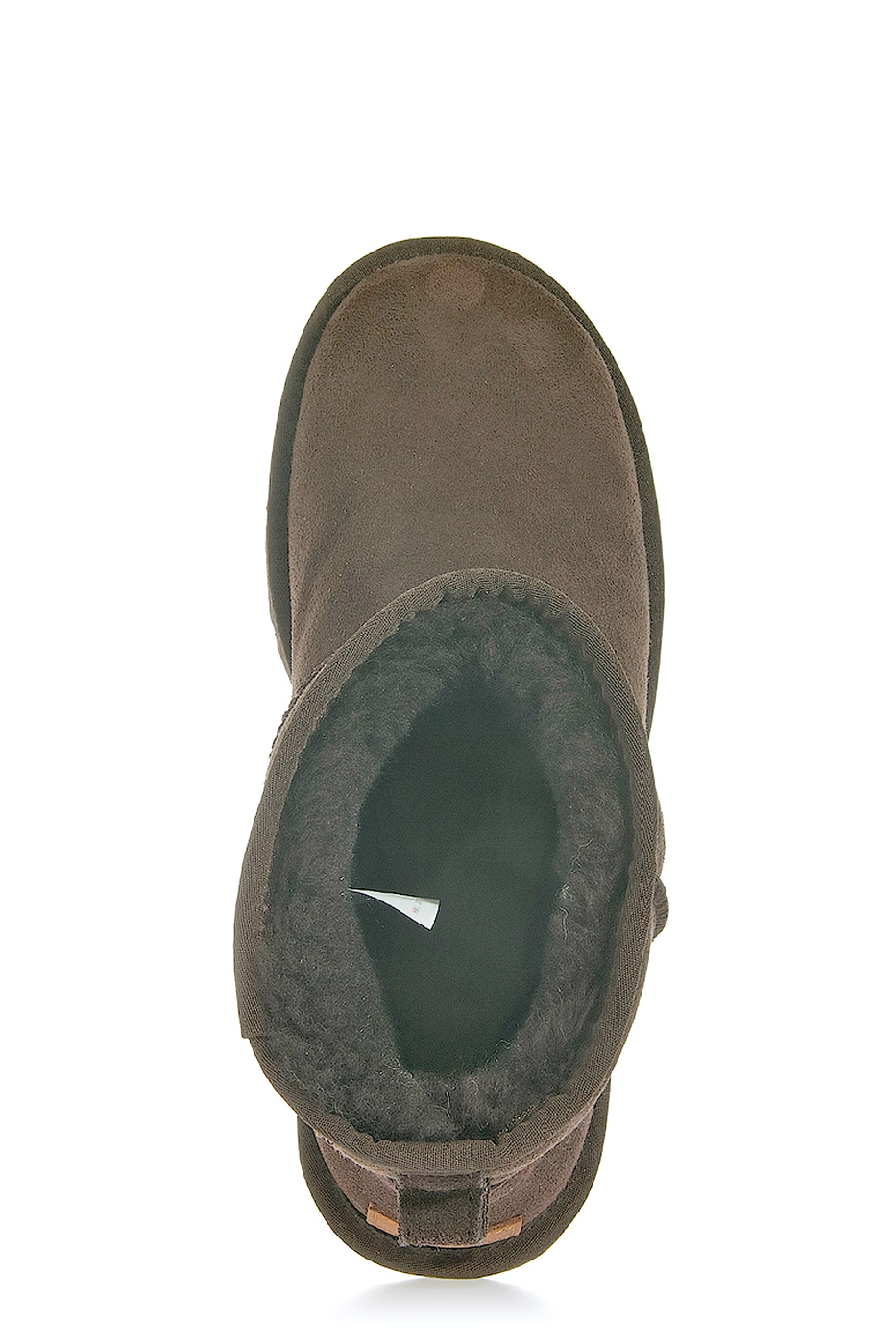 Унты выполнены из натуральной замши, верх оформлен объемными швами. Задник укреплен вставкой и дополнен логотипом бренда. Внутренняя отделка из натуральной шерсти.
