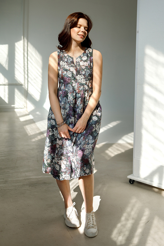 Женственность и лёгкость демонстрирует представленная модель льняного сарафана. А – силуэт наделён роскошной струящейся юбкой с многочисленными складками, которая интригует своей формой, скрывая черты женского тела. Конструктивно - линия талии чуть выше естественного расположения, благодаря чему, силуэт удлинён по вертикали, придавая ещё более стройные черты. Отличительной особенностью модели является принт, который нанесён на лён. Подобные колористические оттенки очень хорошо и деликатно дополнят цветотип любой девушки или женщины. Данный сарафан подразумевает самую разнообразную обувь и аксессуары. Всё будет зависеть от ваших предпочтений и ситуации, на которую вы планируете его надеть. С уверенностью можно сказать – восхищённые взгляды окружающих не упустят вас из виду.