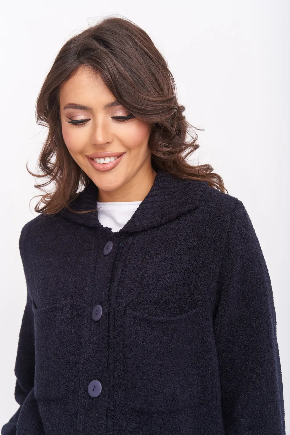 Женский вязаный жакет прямого силуэта с воротничком, на пуговицах. На груди два накладных кармана. Рукава втачные длинные с эластичными манжетами. Жакет выполнен из качественной буклированной пряжи с составом 30% хлопок/70% ПАН, очень мягкой, нежной и приятной к телу.