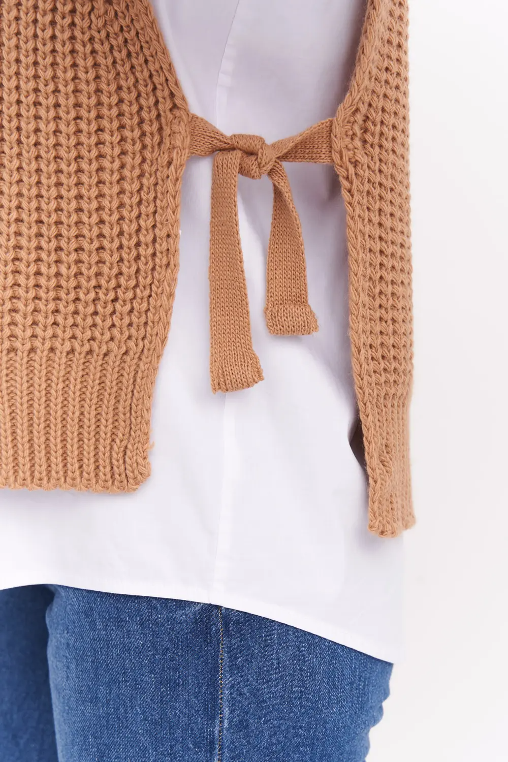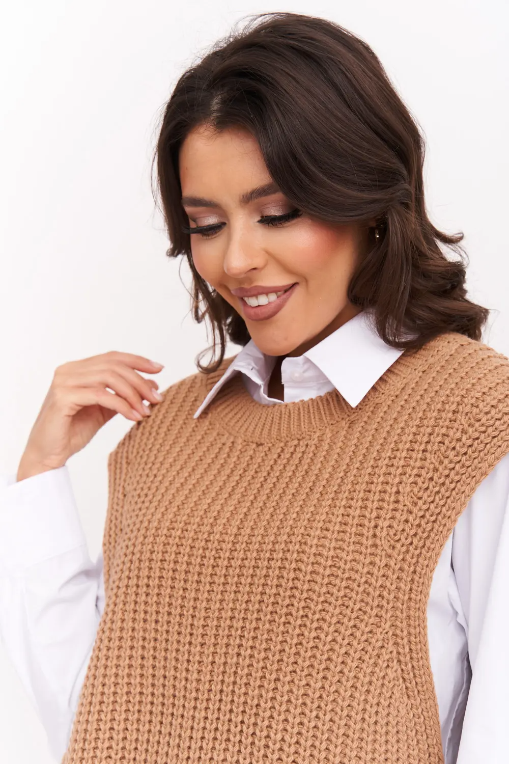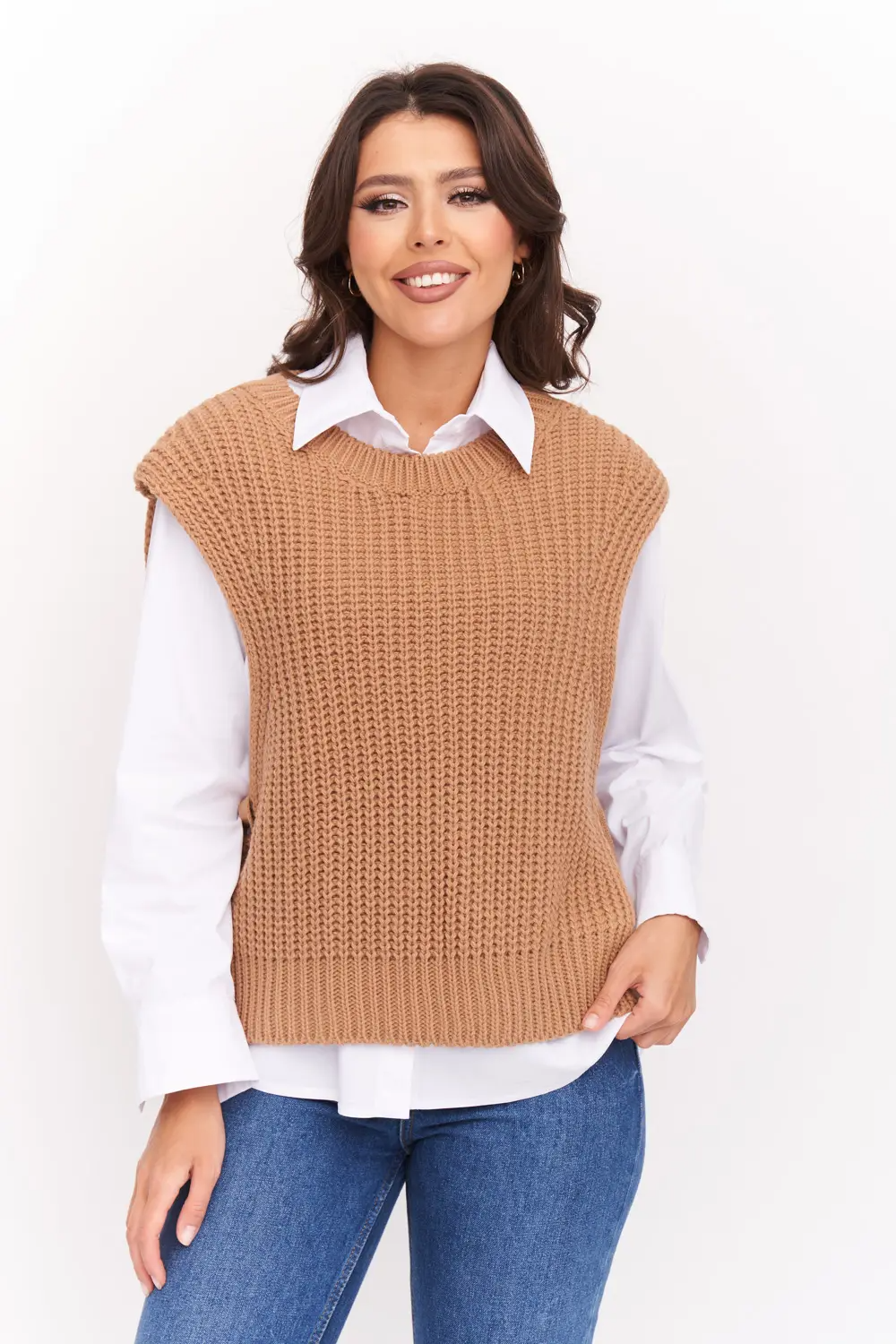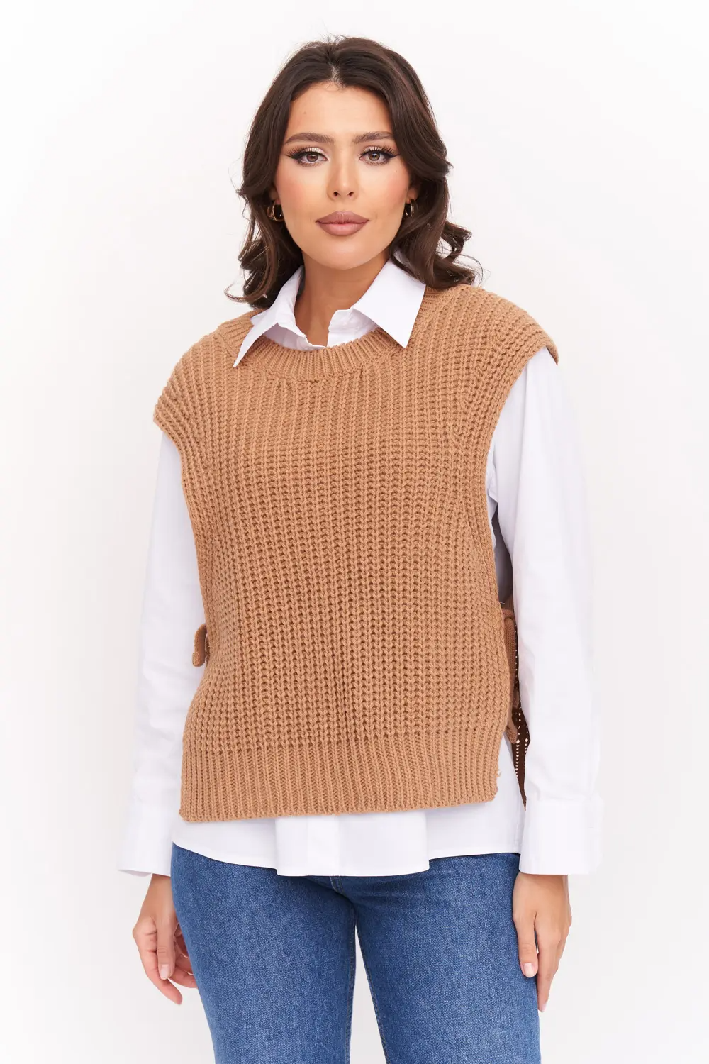 Оригинальный жилет прямого кроя.  Круглая горловина с широкой эластичной резинкой, плечо спущенное. Удлиненная спинка,  которая соединяется с передом по бокам трикотажными лентами, Можно надевать в офис и школу поверх блуз, очень практичный в использовании. кэмэл