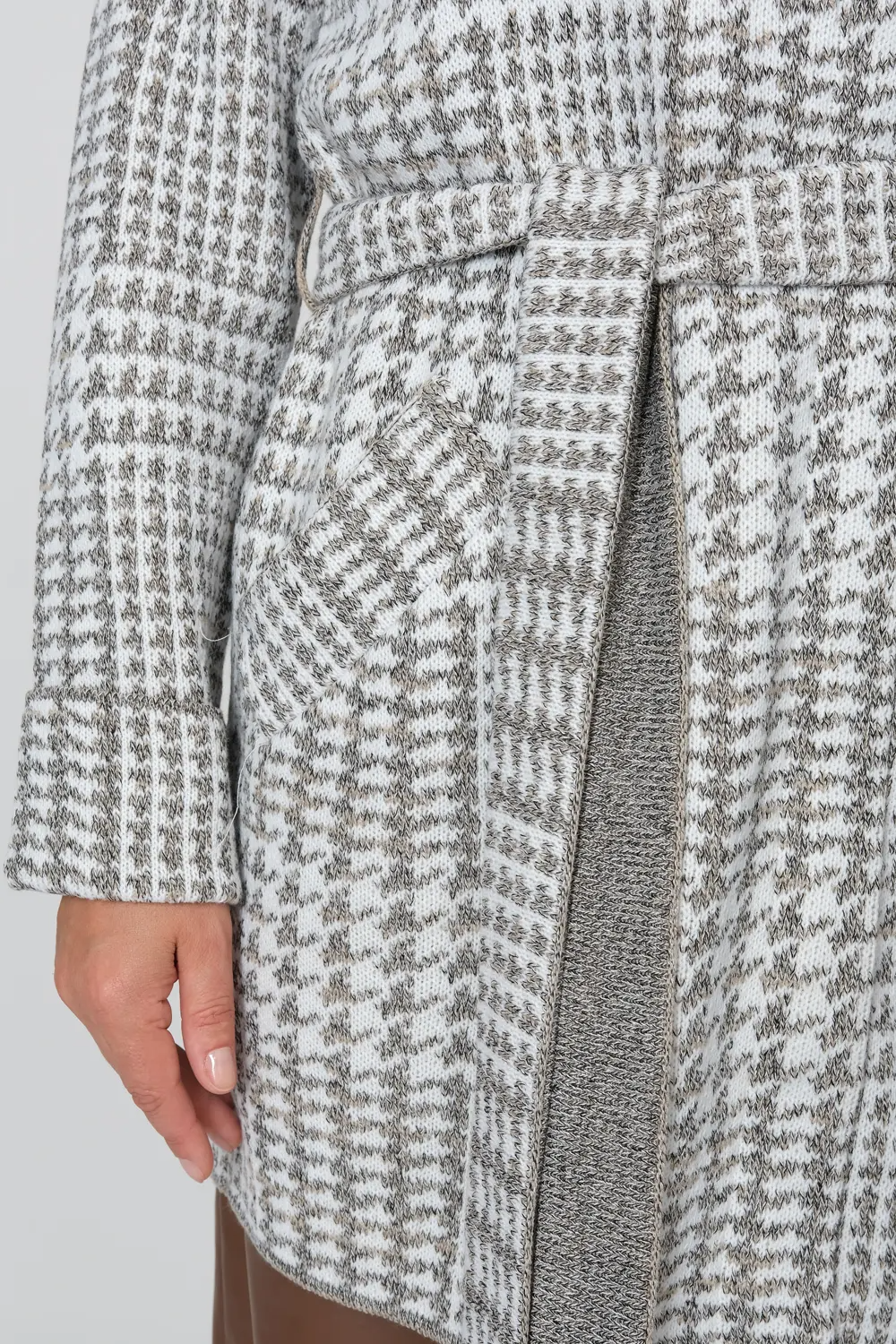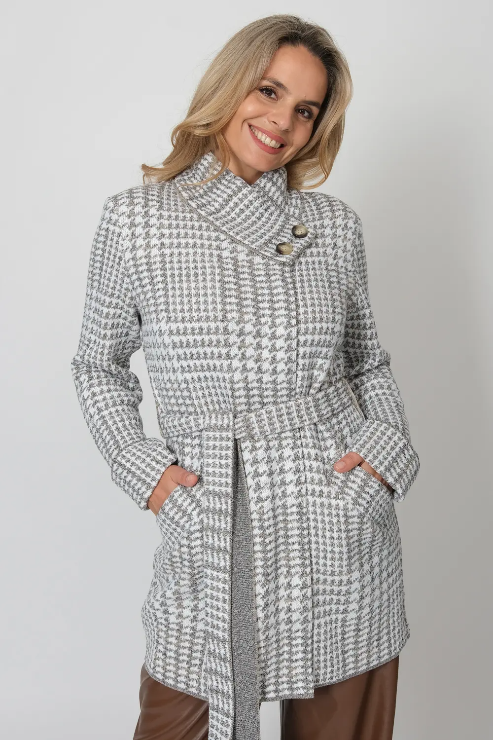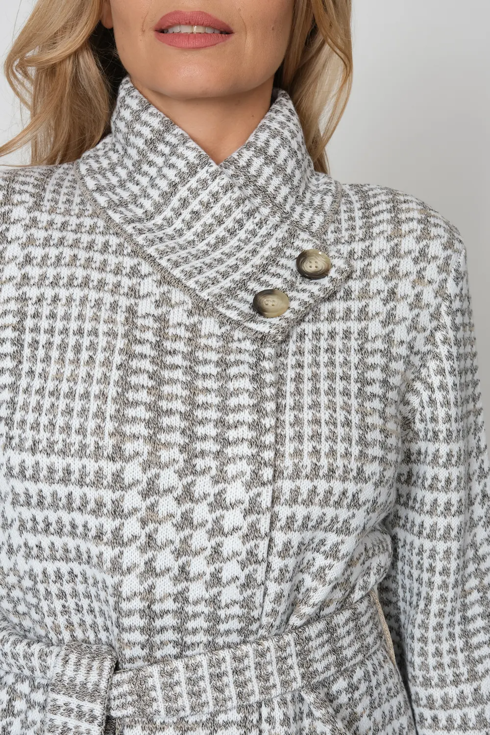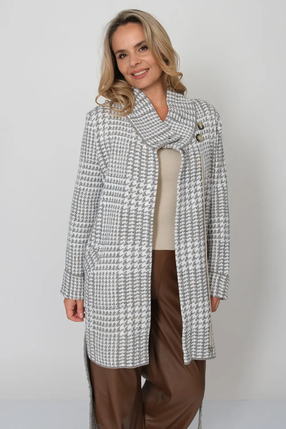 Женский трикотажный кардиган прямого силуэта. Рукава втачные длинные, воротник-стойка. Ассиметричная застежка на молнии. Два прорезных кармана с листочкой. Кардиган выполнен жаккардовым переплетением, образующим клетку. бежевый