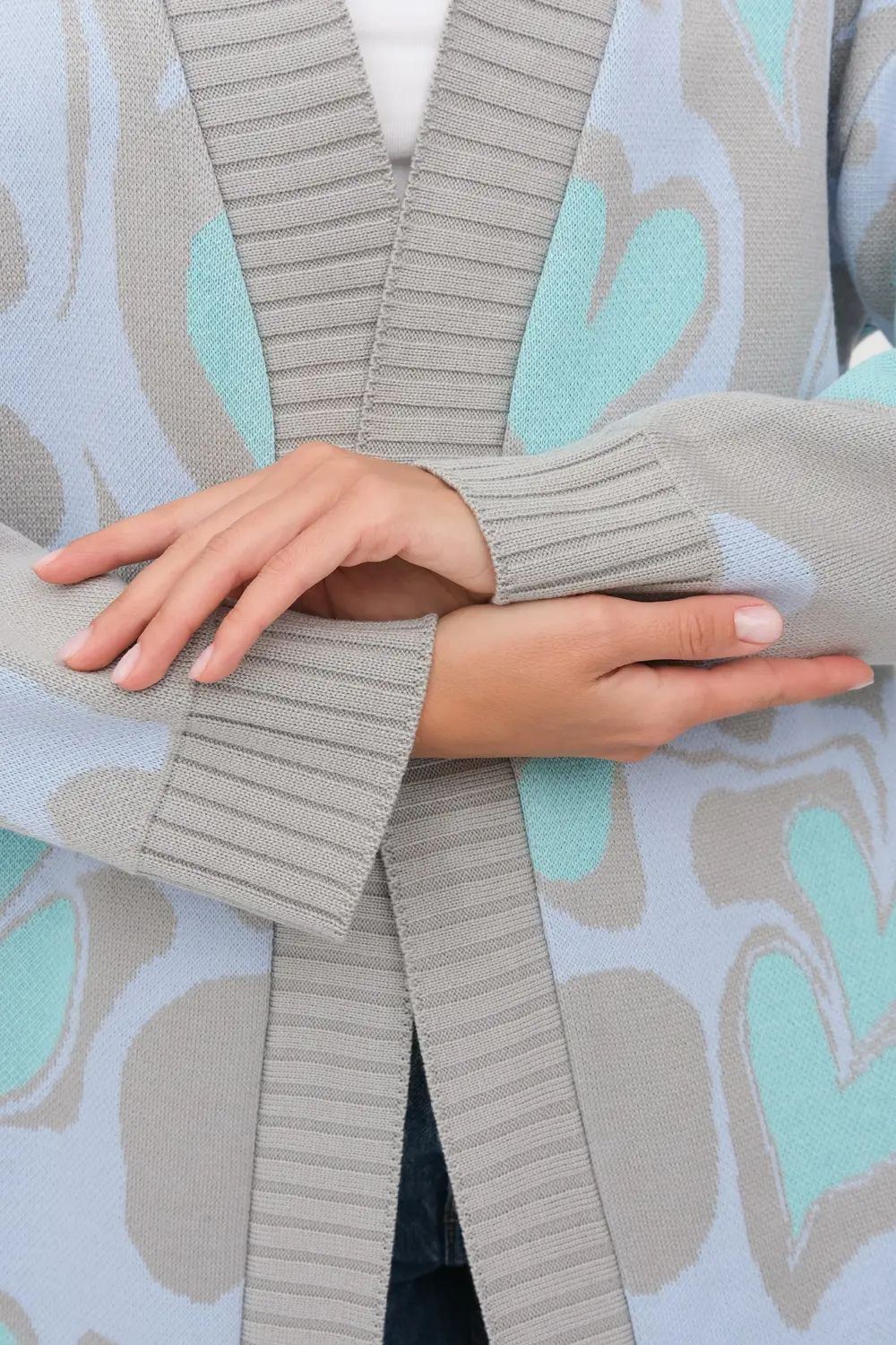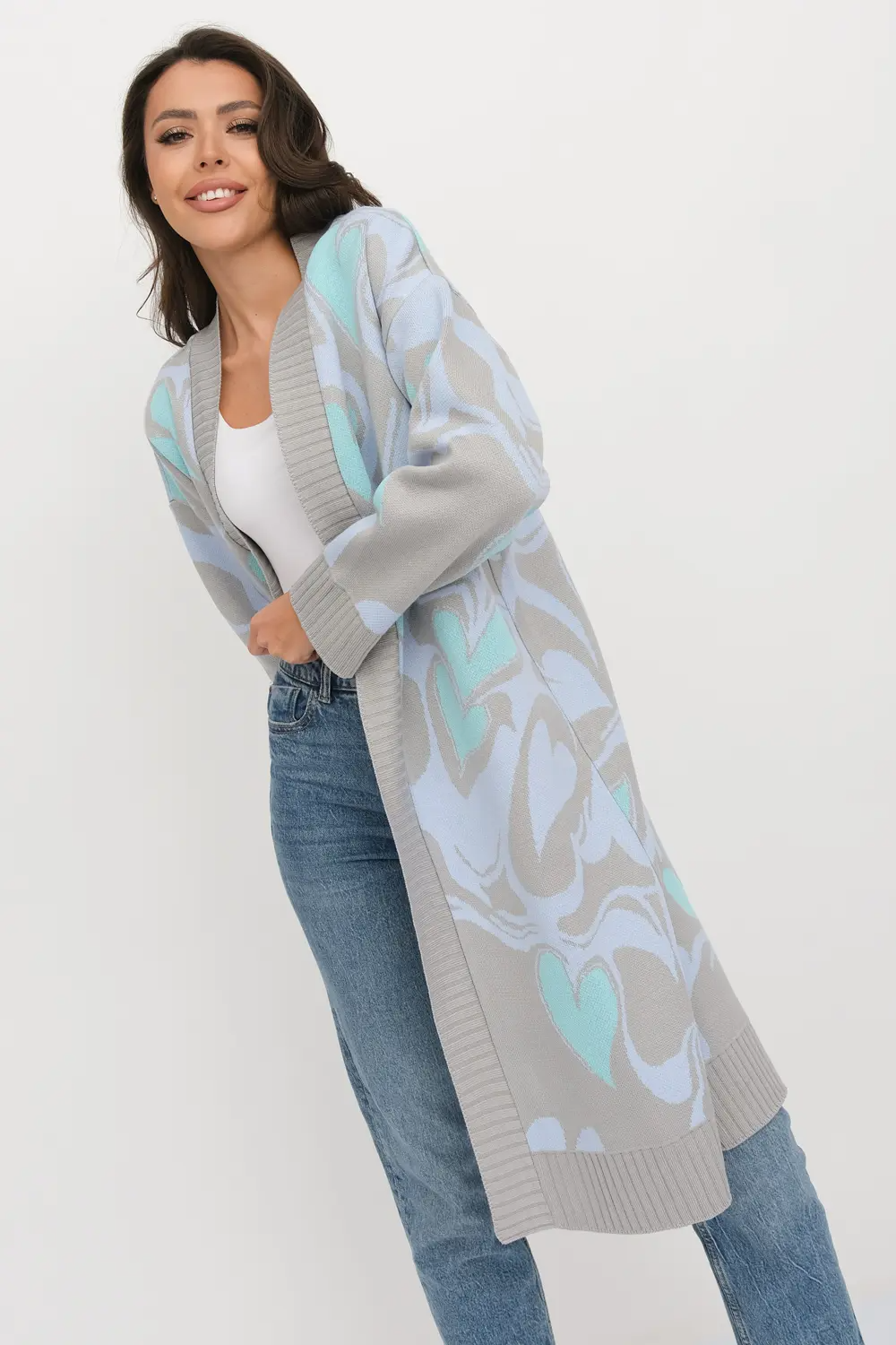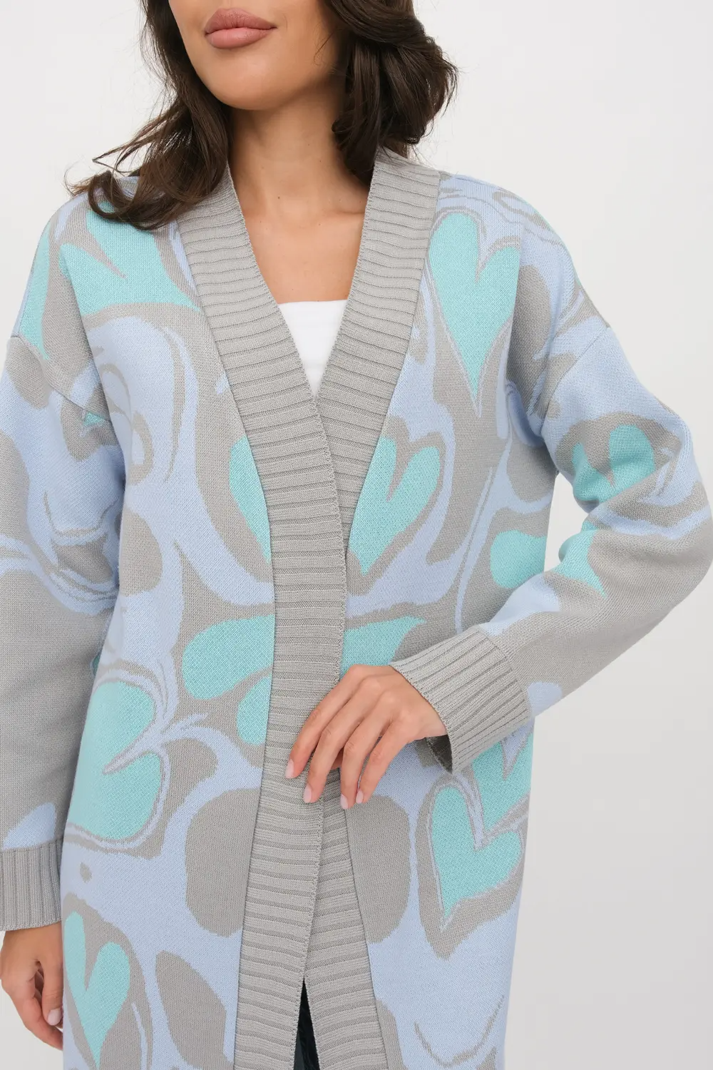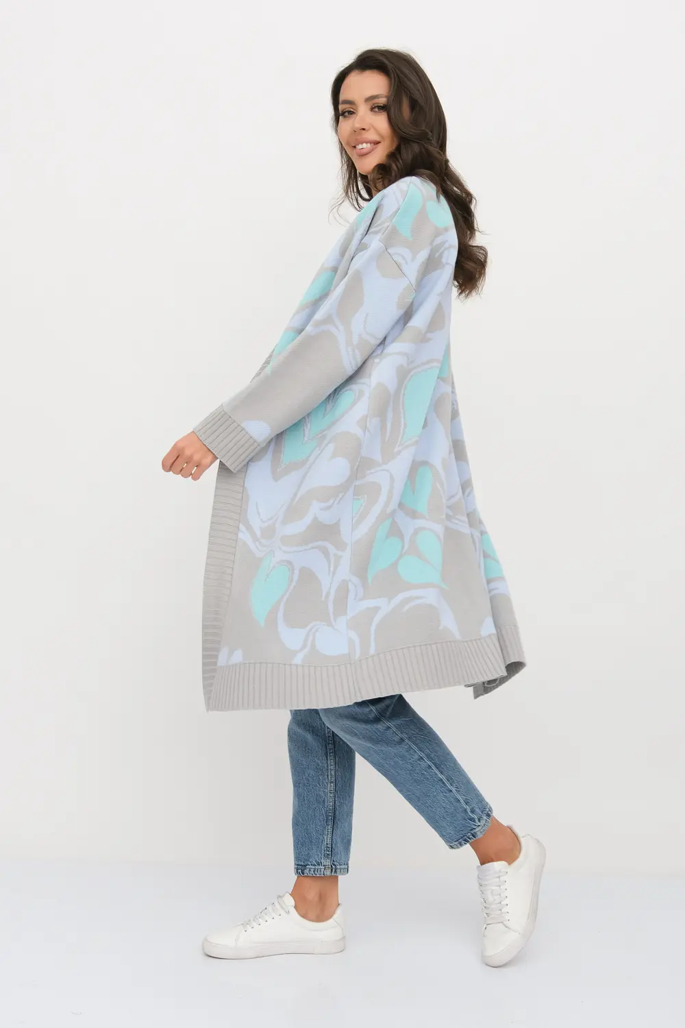 Кардиган женский вязаный свободного силуэта. V-образный вырез. Спущенное плечо, длинный рукав. По низу рукава и изделия эластичная резинка. Кардиган выполнен жаккардовым переплетением с абстрактным рисунком.Стильный кардиган станет незаменимой вещью в Вашем гардеробе, отлично сочетаясь с платьем, юбкой или брюками. серо-голубой