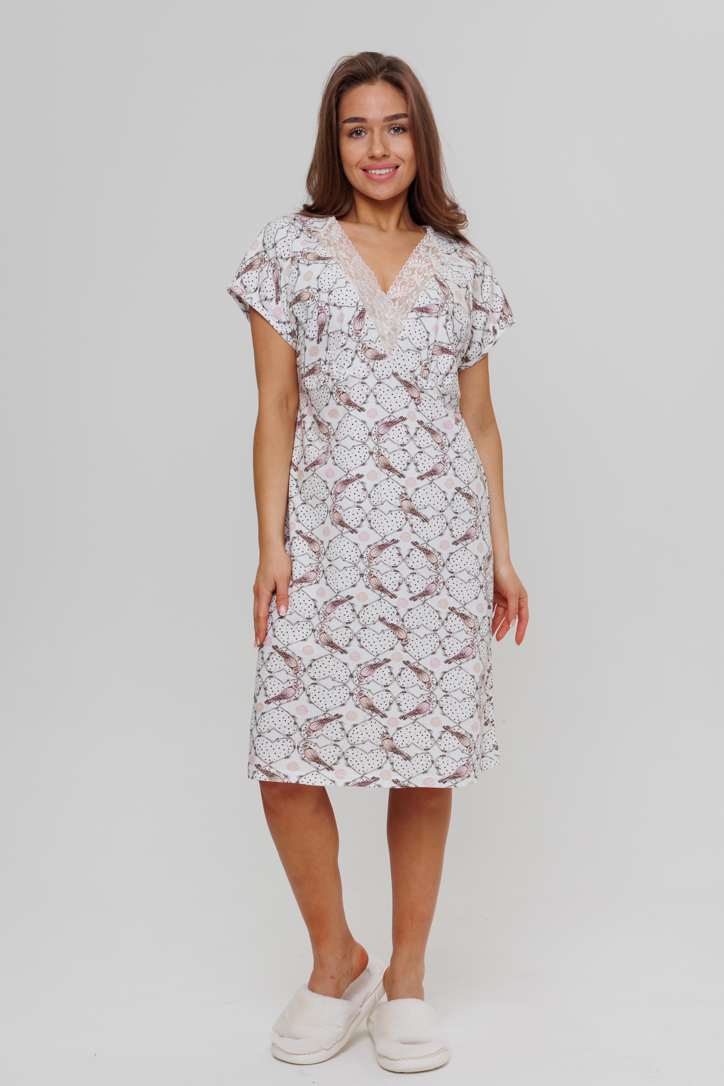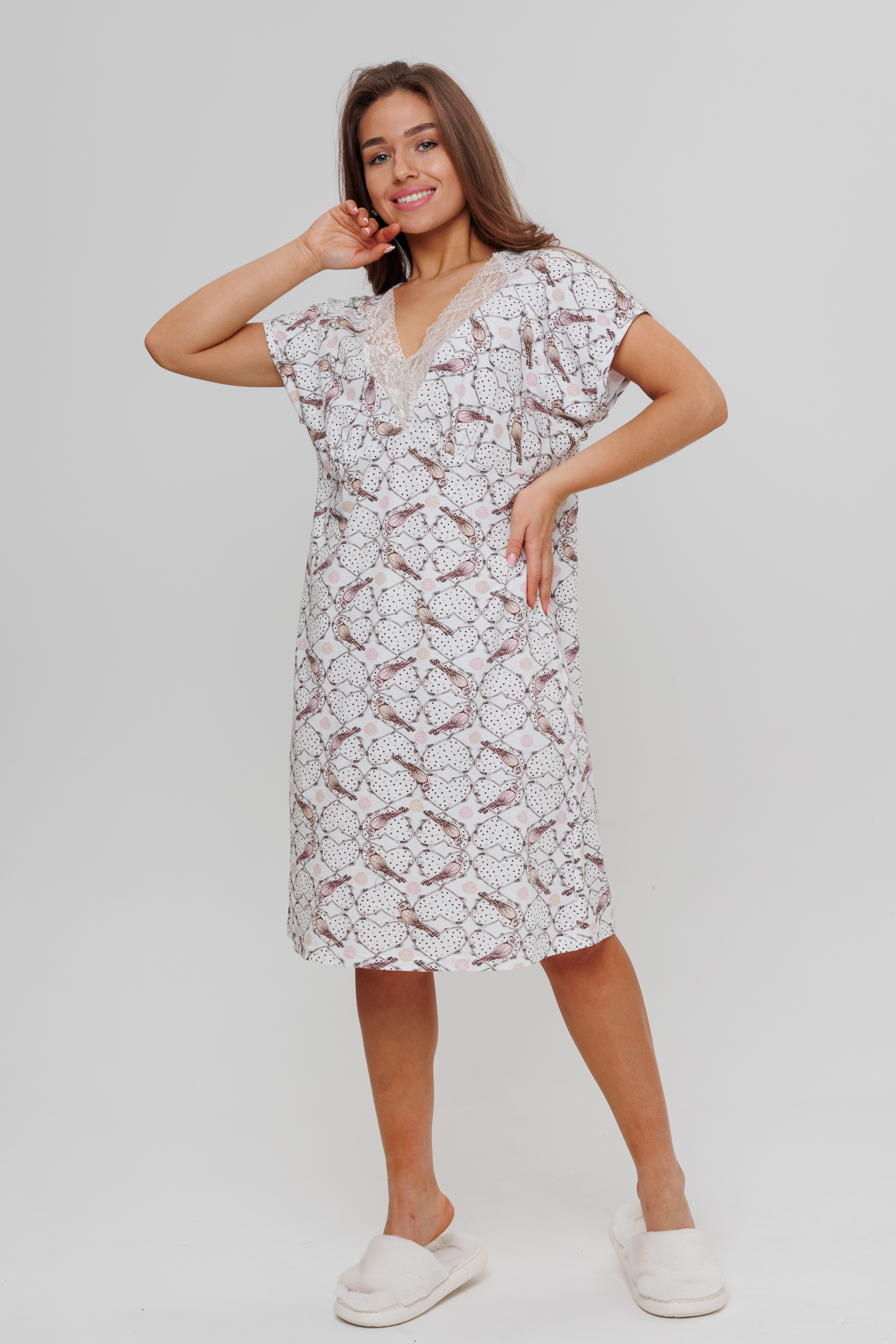 Ночная сорочка свободного прилегания. Горловина обработана эластичным мягким кружевом. Короткий рукав, фигурный вырез под грудью.