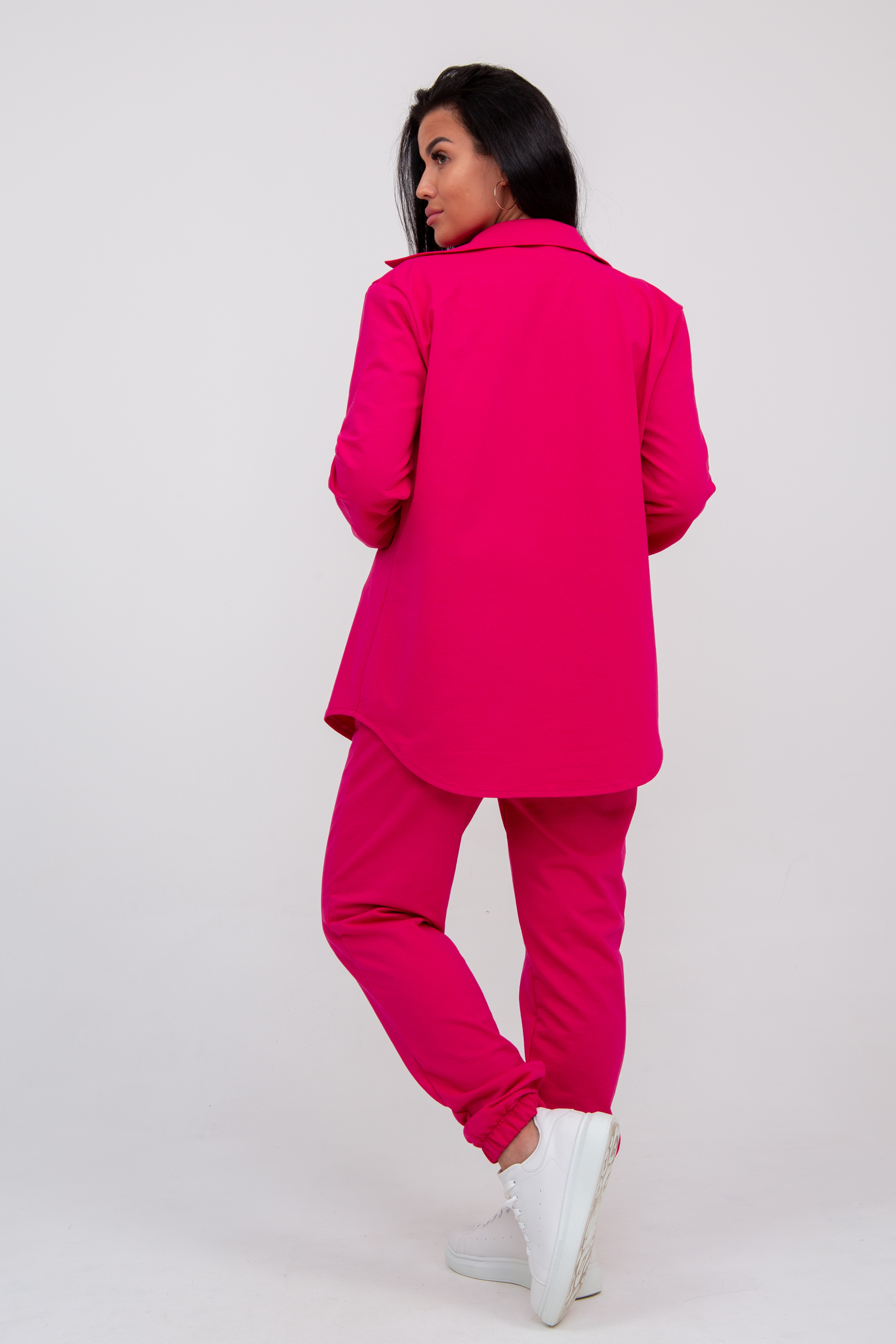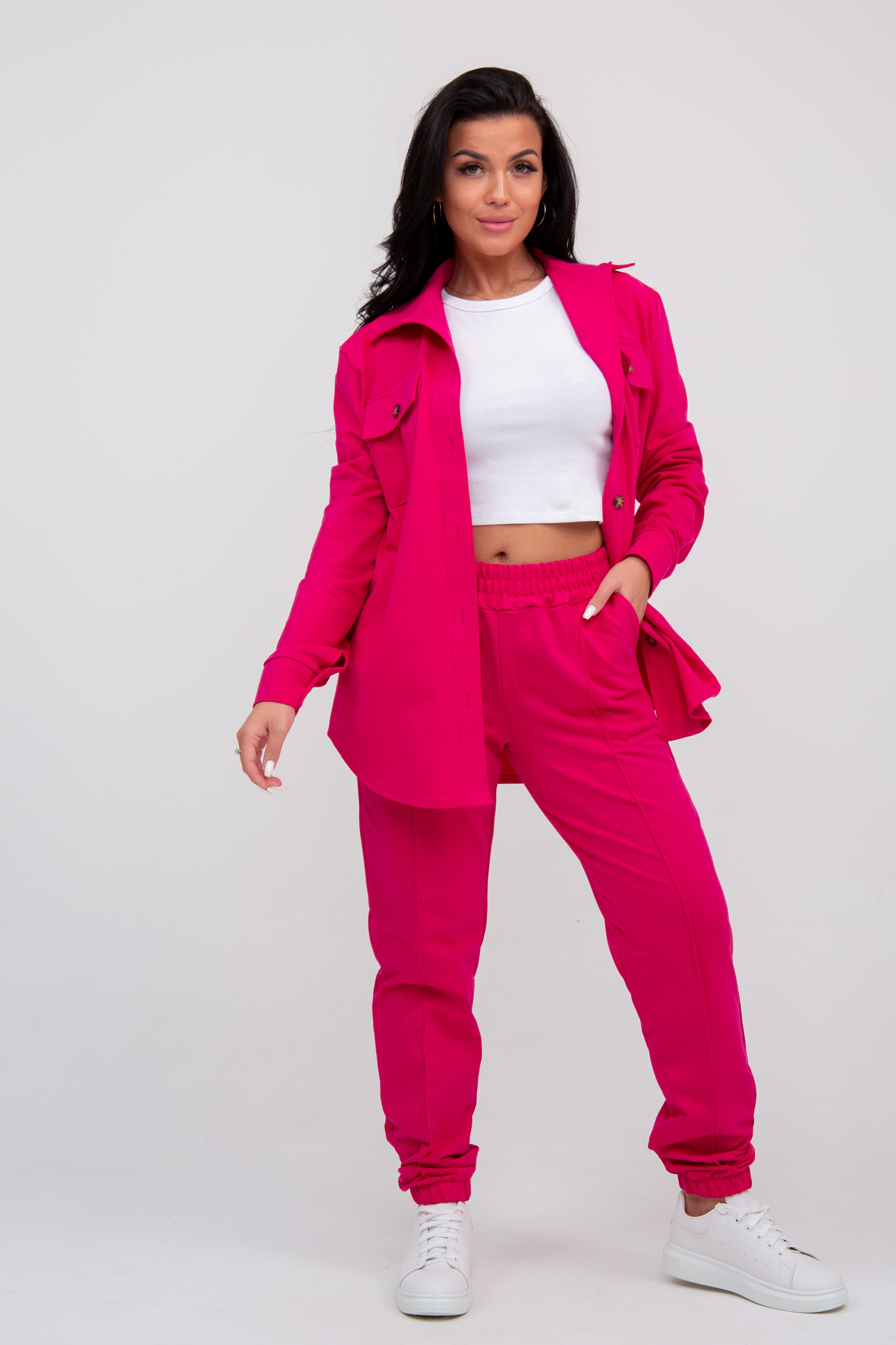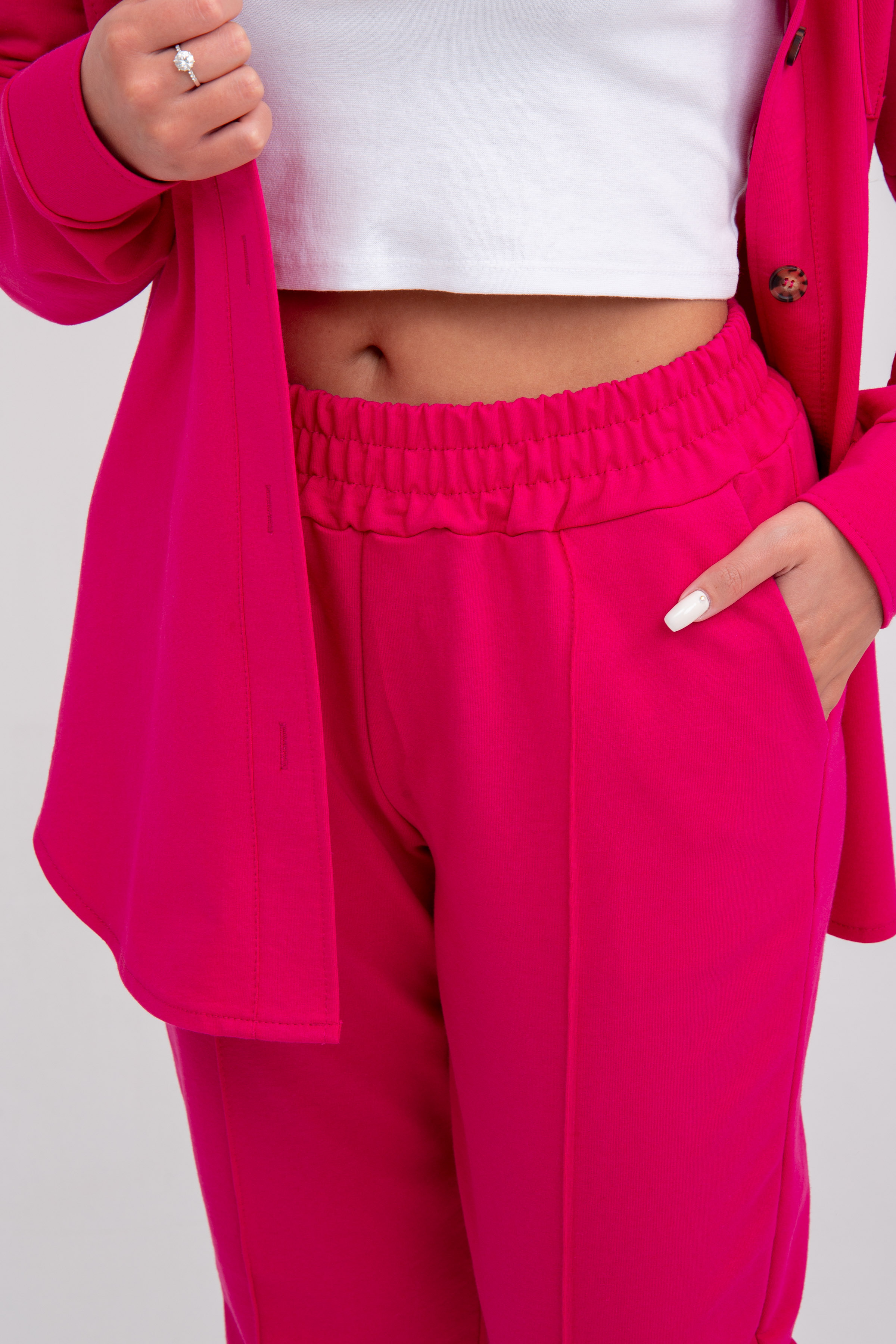 Брюки своодного кроя, по низу на резинке, имеют прорезные карманы и отрезной пояс.
