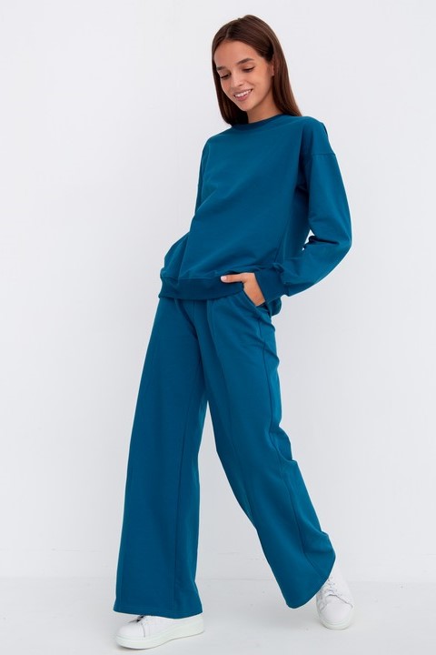 Костюм свободного кроя состоит из толстовки и брюк.