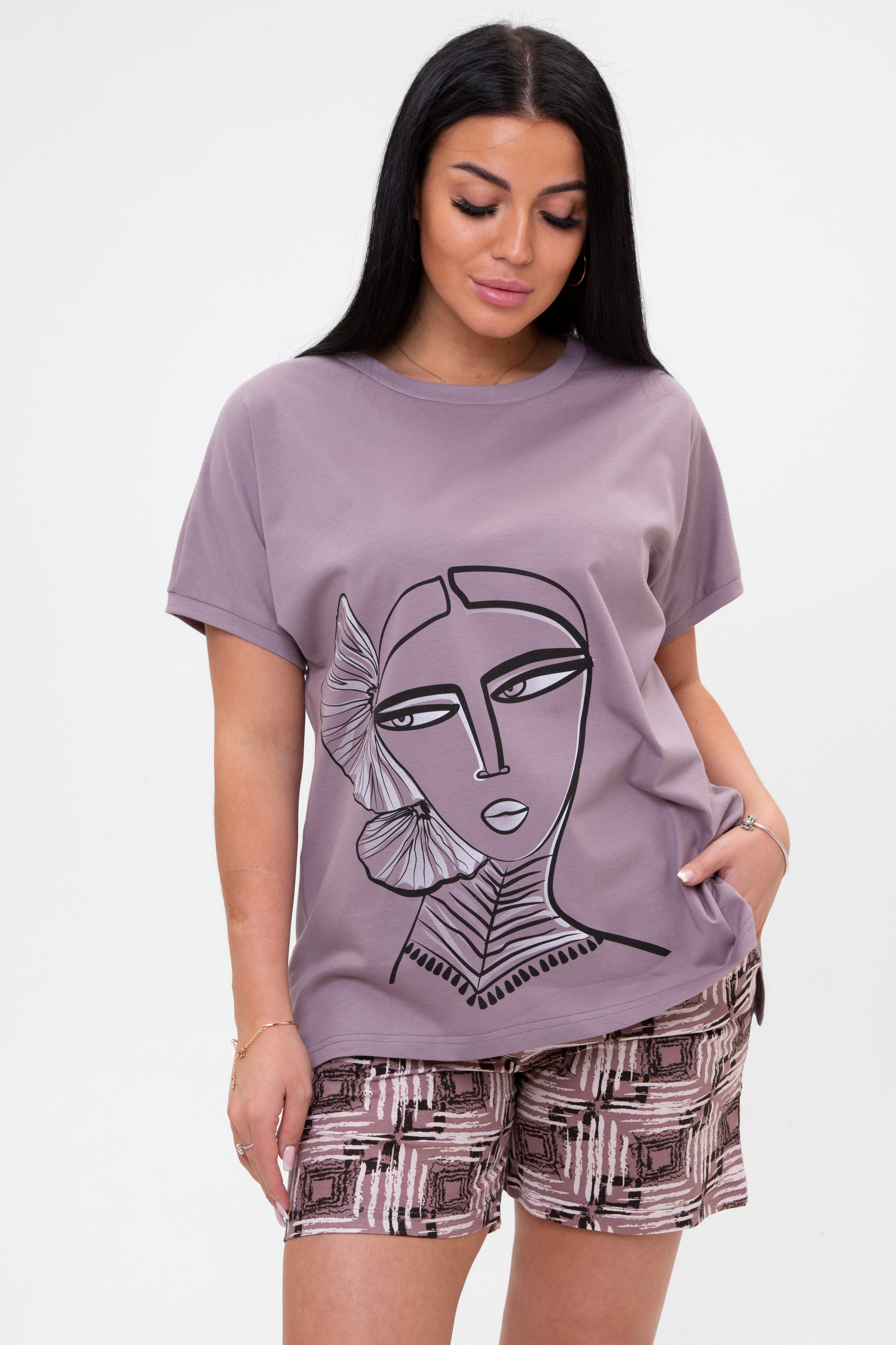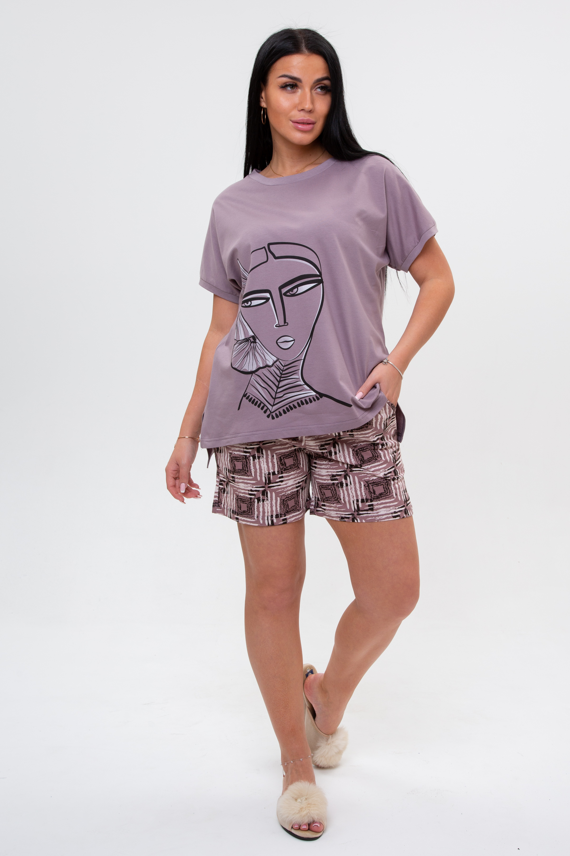 Уютный домашний костюм, выполнен из 100% хлопка. Футболка свободного силуэта с дизайнерским принтом. Футболка без рукавов со спущенной проймой. Шорты свободного прилегания на отрезном поясе с резинкой, имеют 2 кармана, длина шорт до середины бедра.