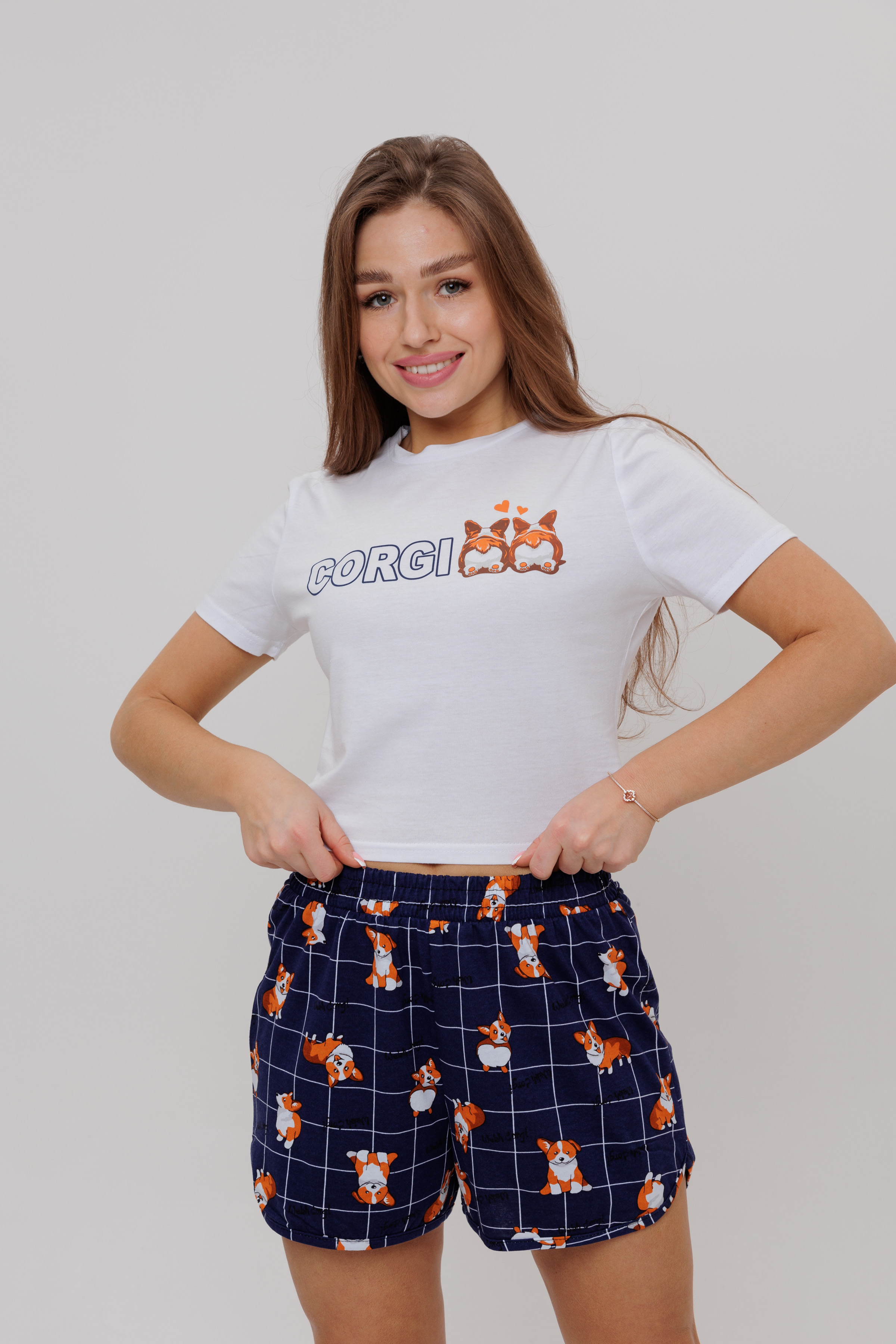 Костюм домашний с шортами из кулирки. Состоит из кроп топа и шорт. На передней полочке топа  дизайнерский принт. Шорты завышенной посадки с окантовкой по низу.