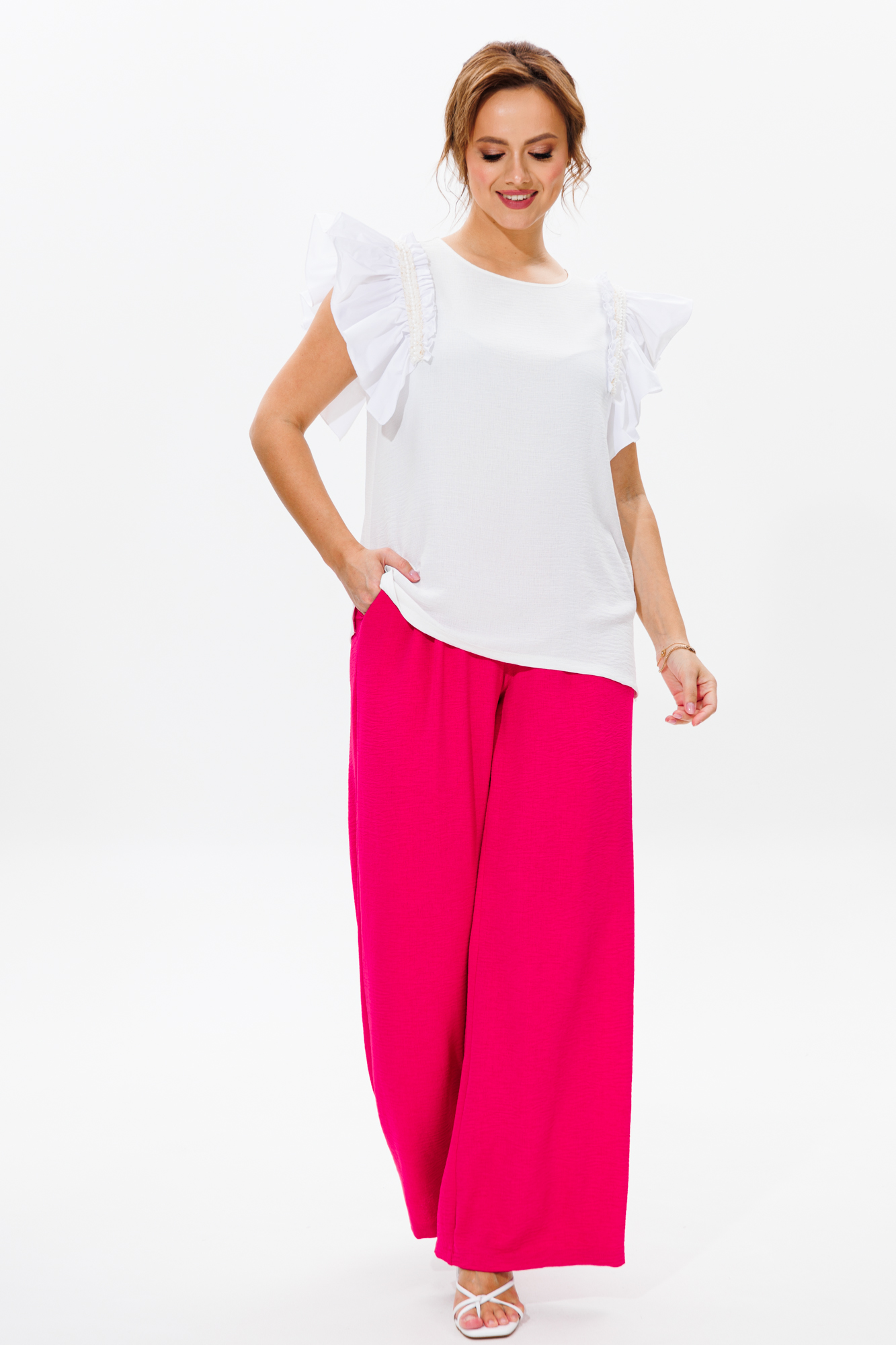 Летний женский костюм, состоящий из брюк и нарядной блузы, выполненный из костюмно-блузочной ткани (тянется).