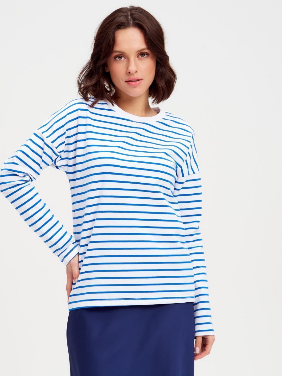 Популярная тельняшка с принтом в полоску отличается свободным фасоном оверсайз, длинным рукавом, спущенной линией плеча и комфортной длиной.