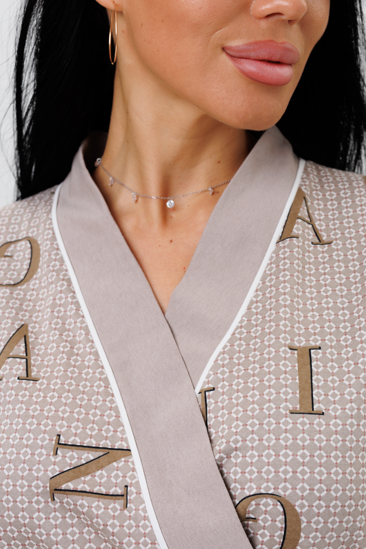 Халат запашной, обработанный планкой из отделочной ткани, задекорированный кантом из ткани компаньона. В боковых швах халата имеются карманы. Длина рукав вместе с манжетом - 3/4. Для удобства подвязывания пояса имеются шлевки.