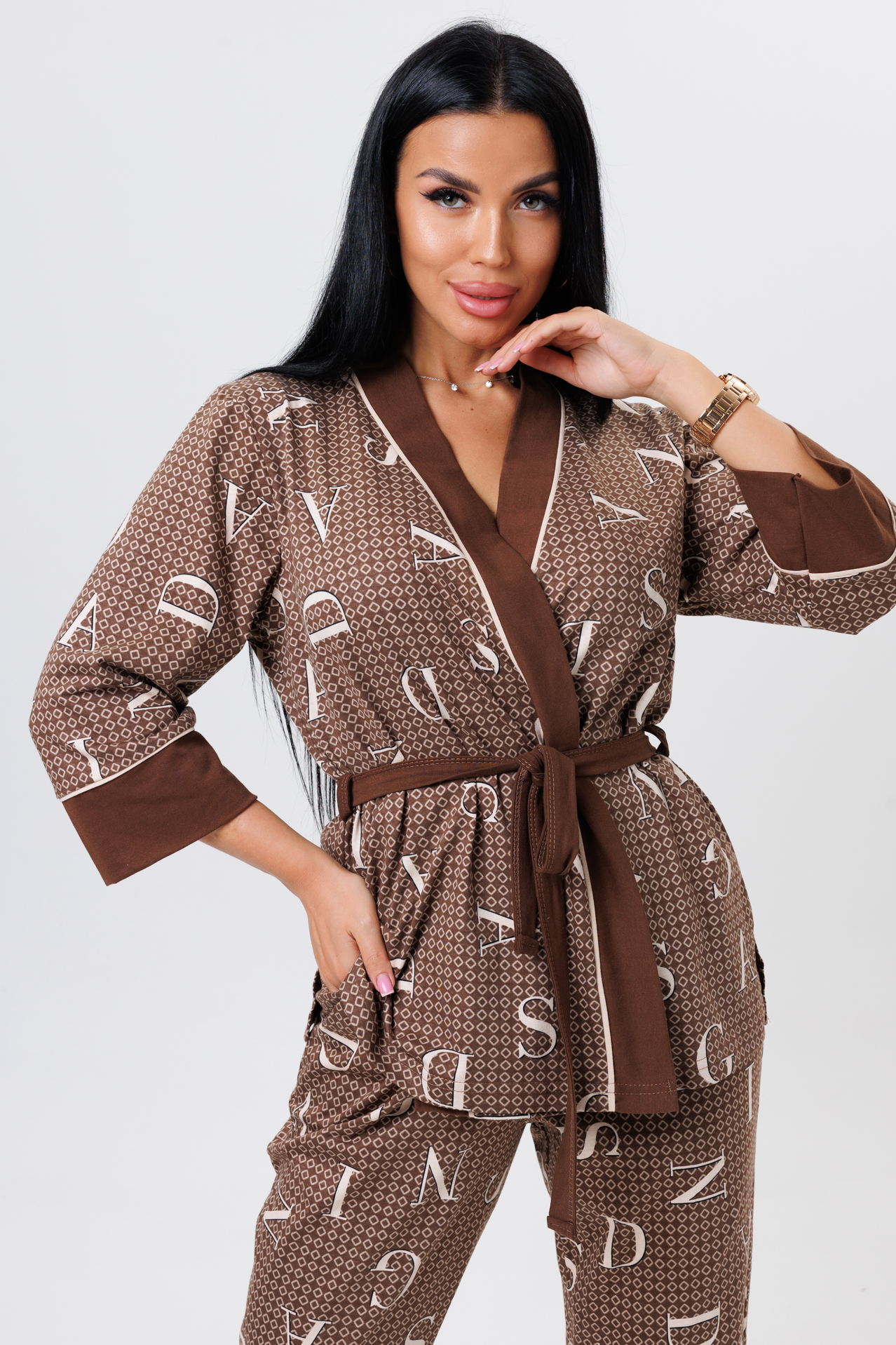 Домашний костюм из кулирки состоит из брюк и туники на запах с поясом. Обтачка туники, низ рукавов и низ брюк выполнены из полотна контрастного цвета с отделкой кантом.
