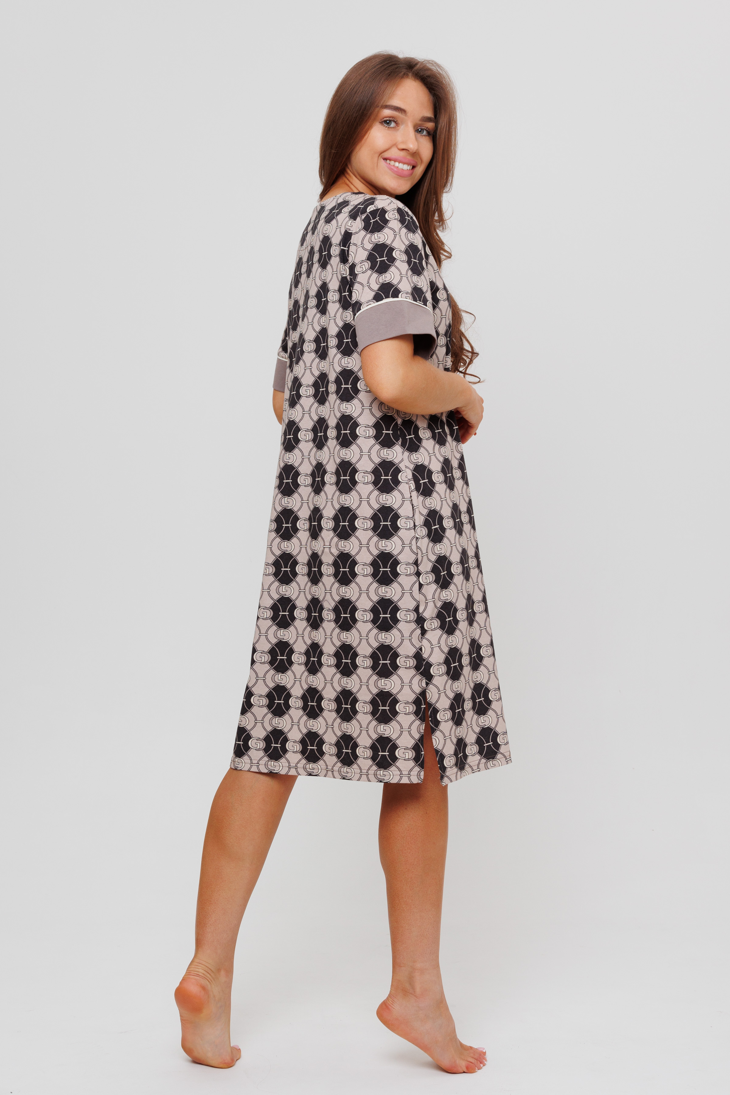Туника домашняя их кулирки. V-образный вырез горловины обработан планкой и контрастным каентом. Длина - до середины колена. Карманы в боковых швах