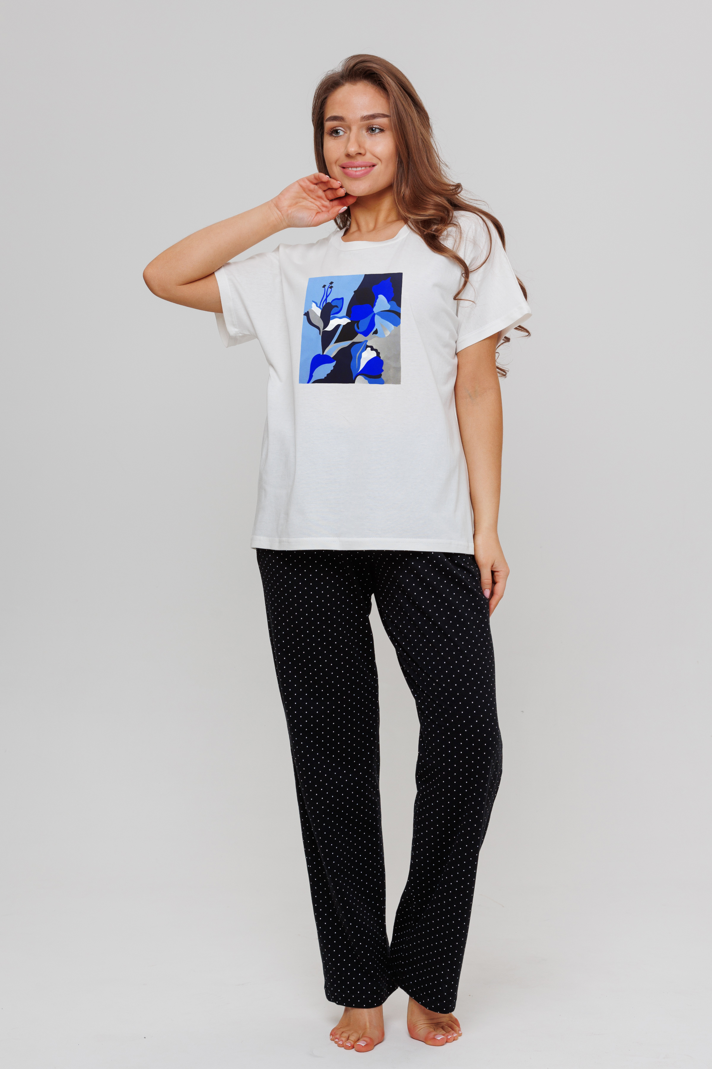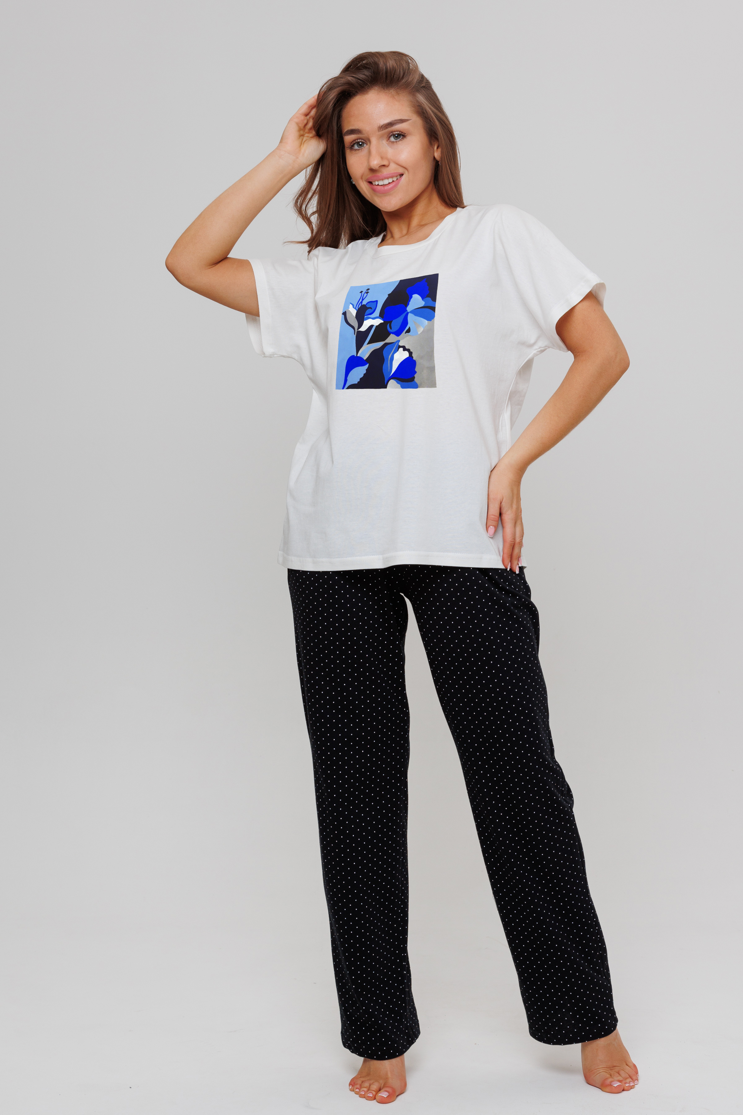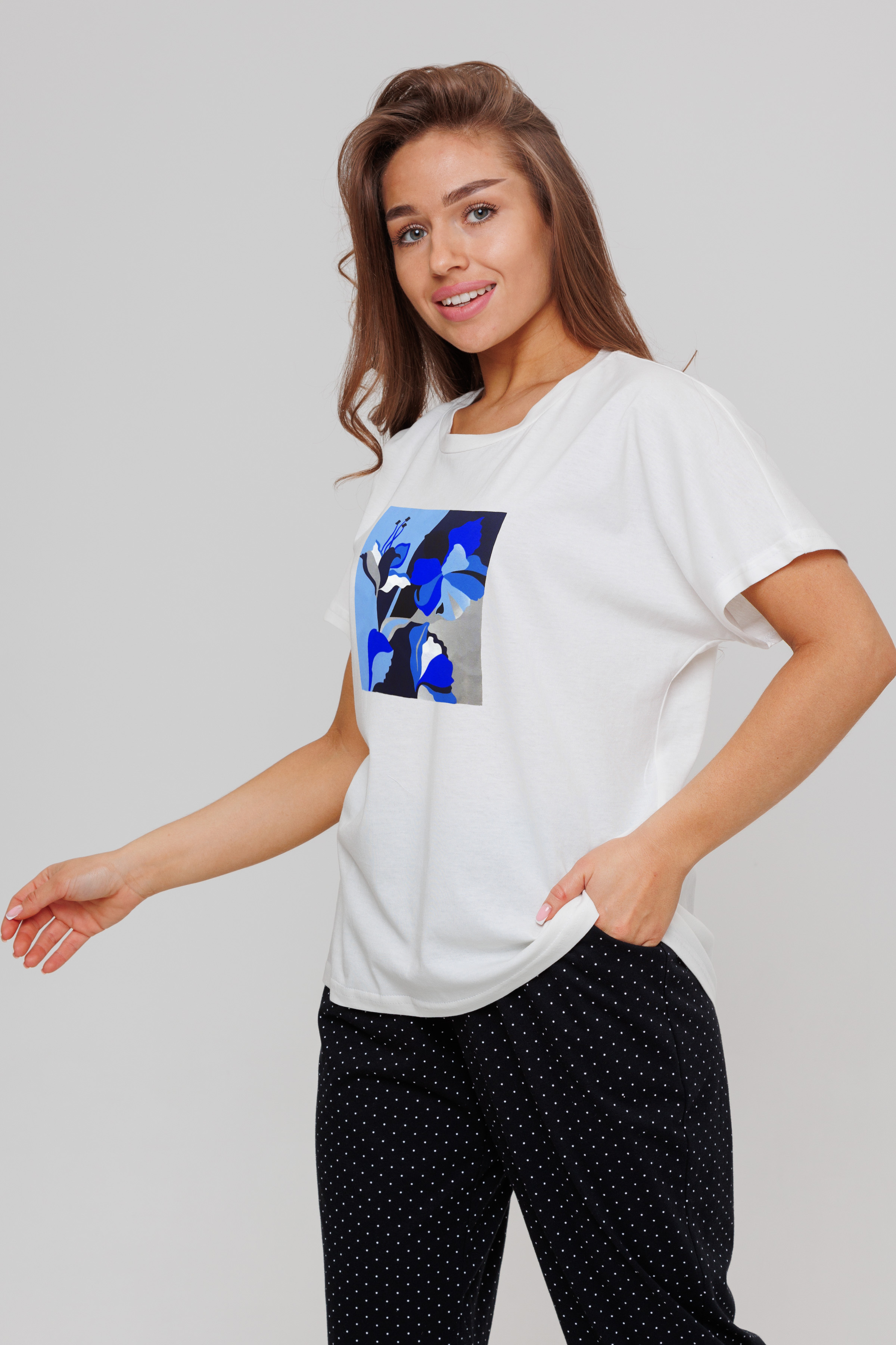 Костюм домашний состоит из футболки и брюк. Футболка свободног кроя, на передней полочке дизайнерский принт. В боковых швах брюк карманы.