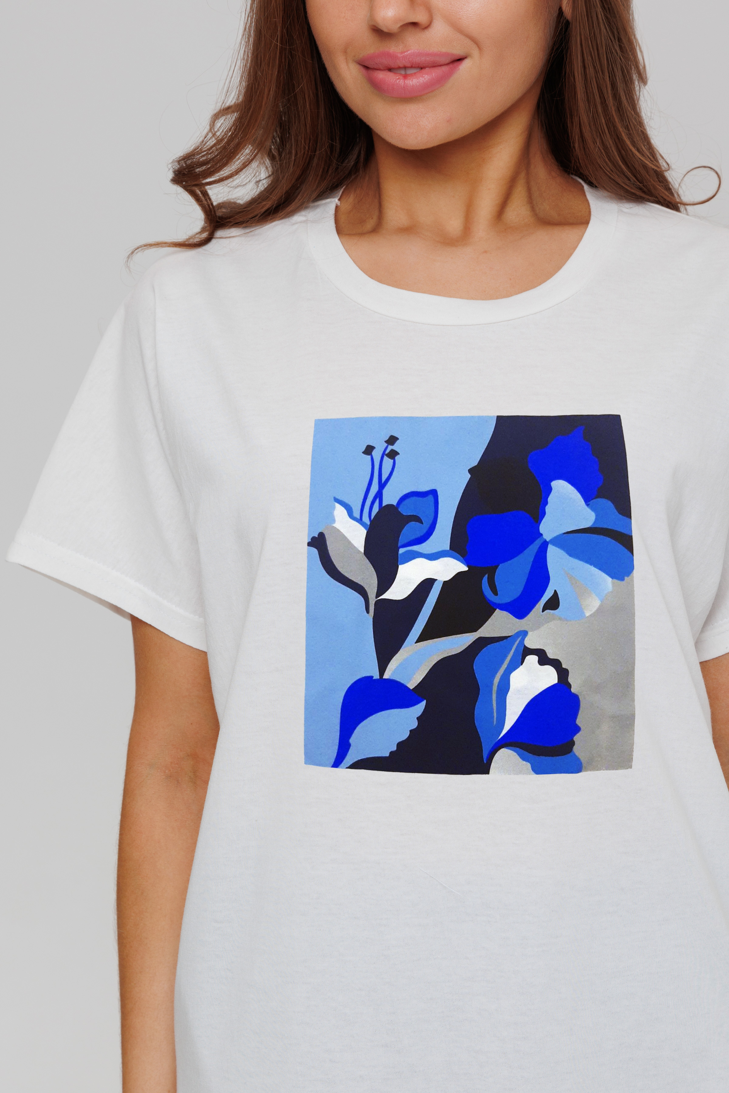 Костюм домашний состоит из футболки и брюк. Футболка свободног кроя, на передней полочке дизайнерский принт. В боковых швах брюк карманы.