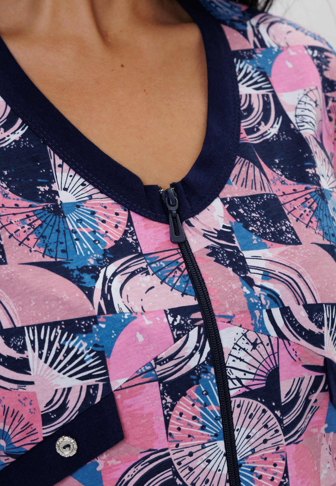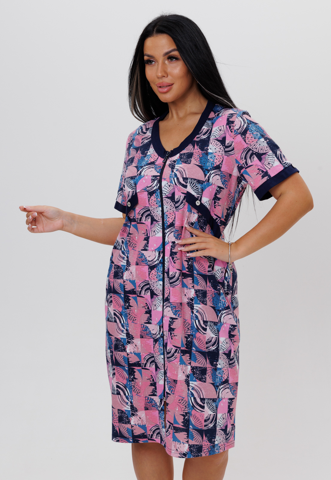 Халат прямого силуэта на молнии с подрезными бочками, задекорированными планками из отделочной ткани.Горловина имеет форму капли, окантованная также отделочной тканью. В виде декора используются пуговицы на рукавах и планках.