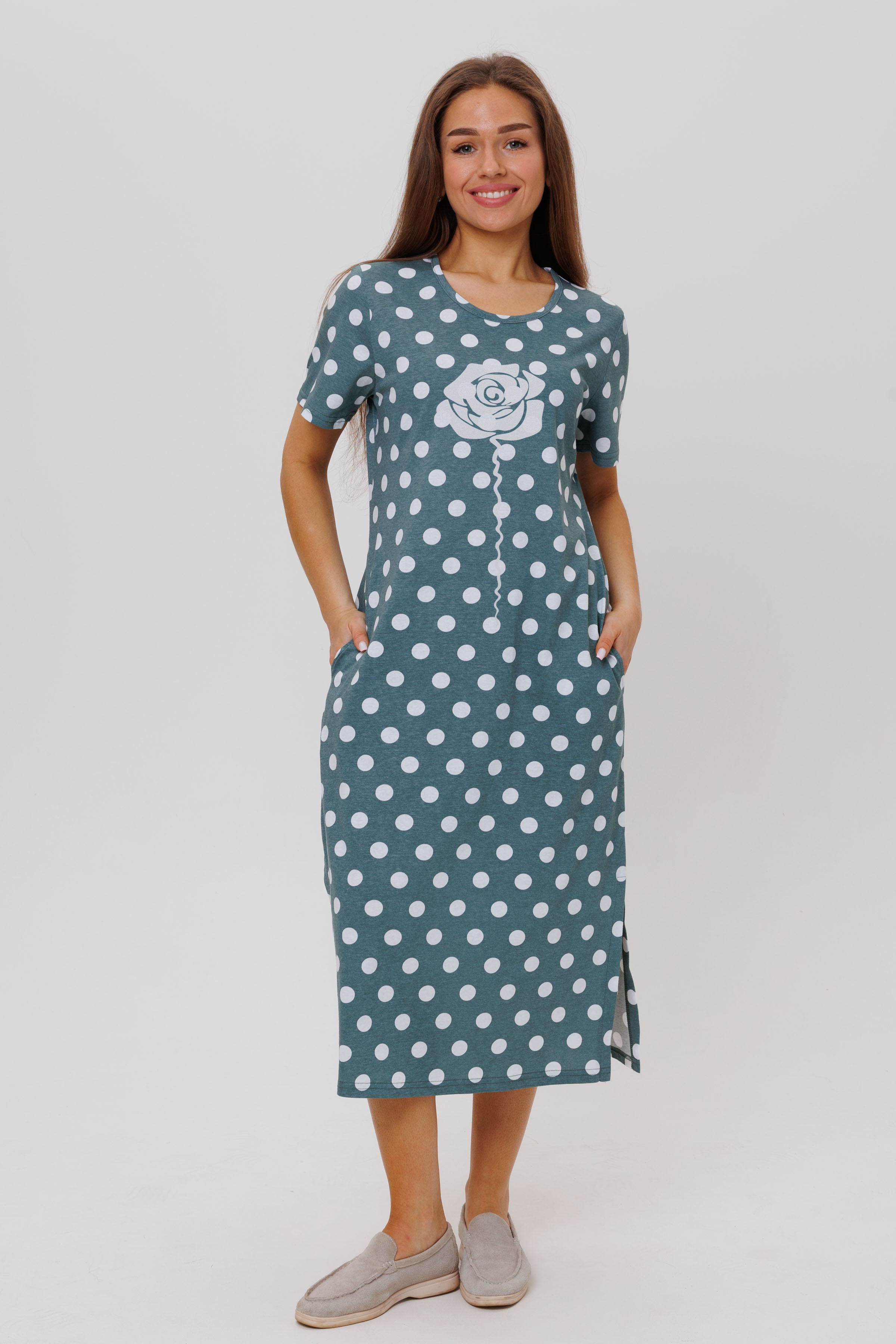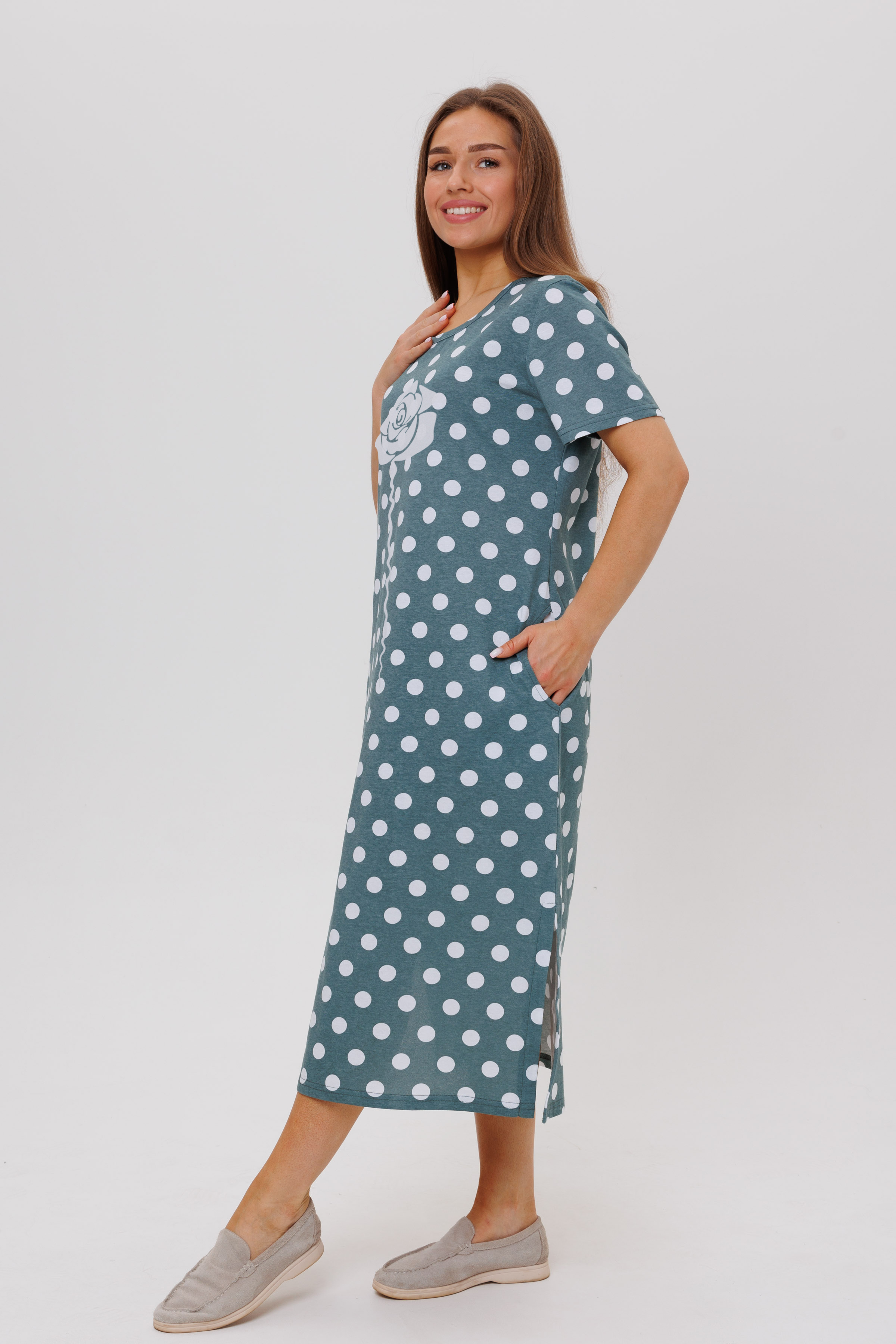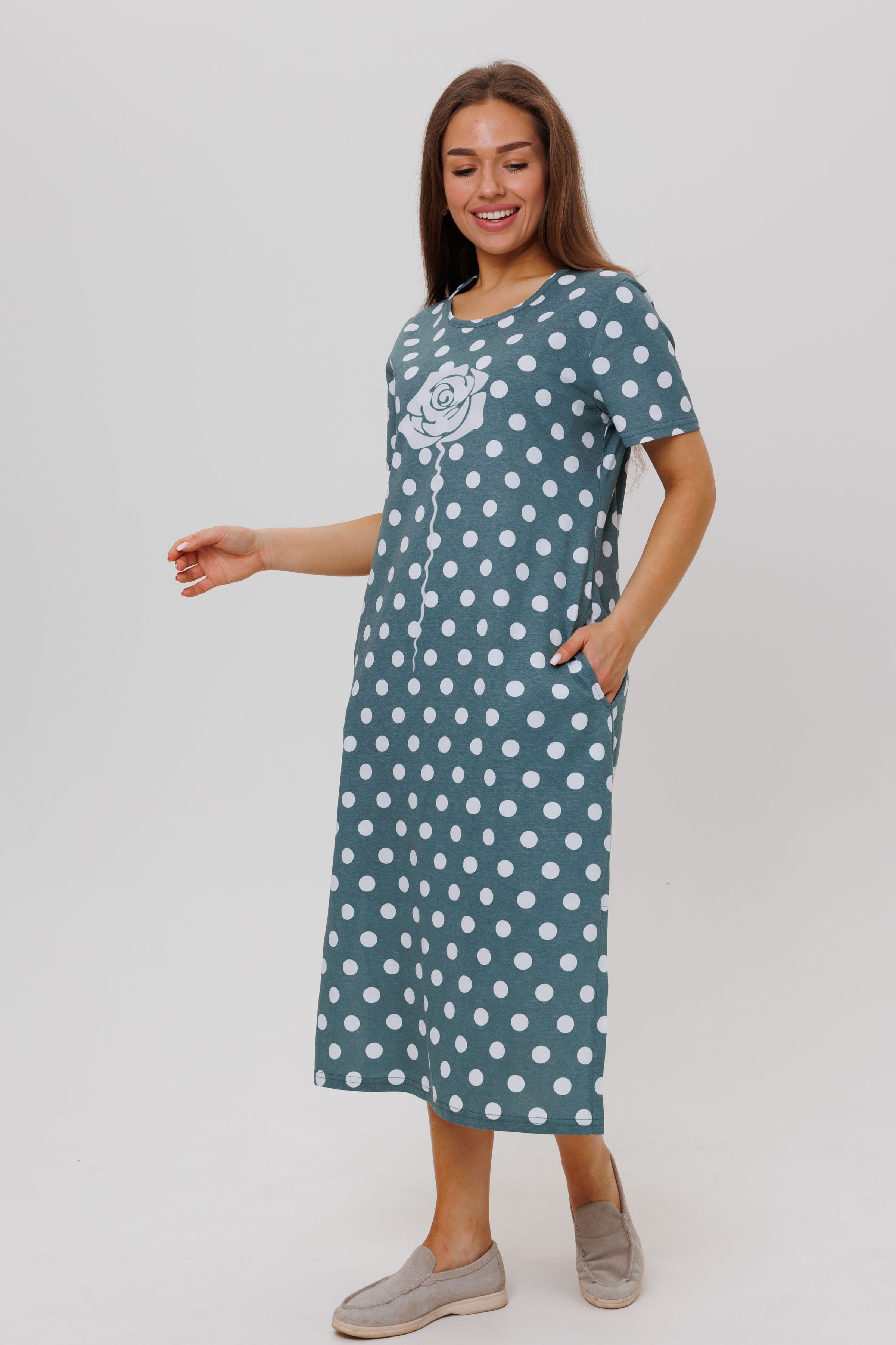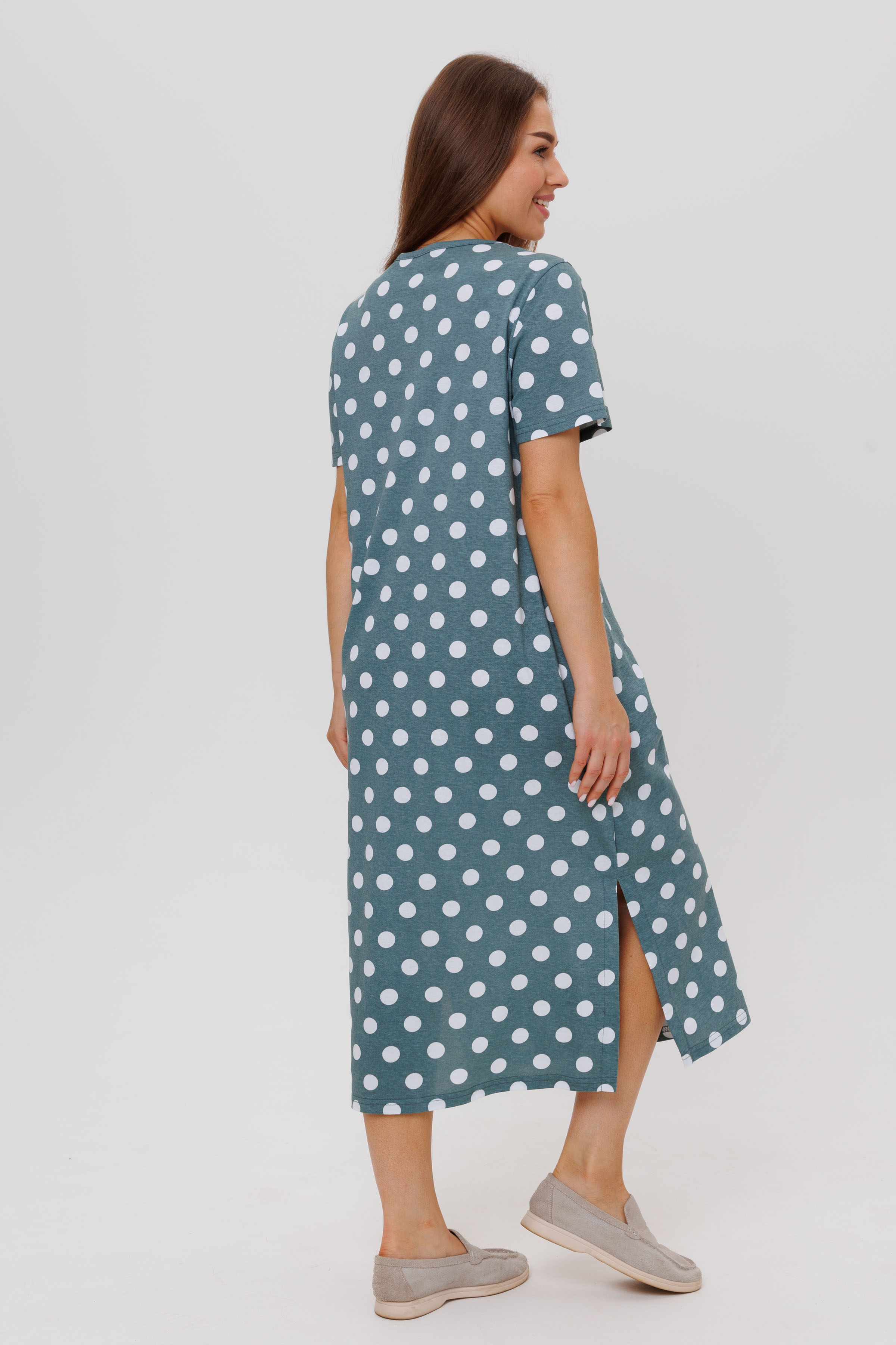 Летнее платье в горошек. Длина - ниже колена, рукава короткие.