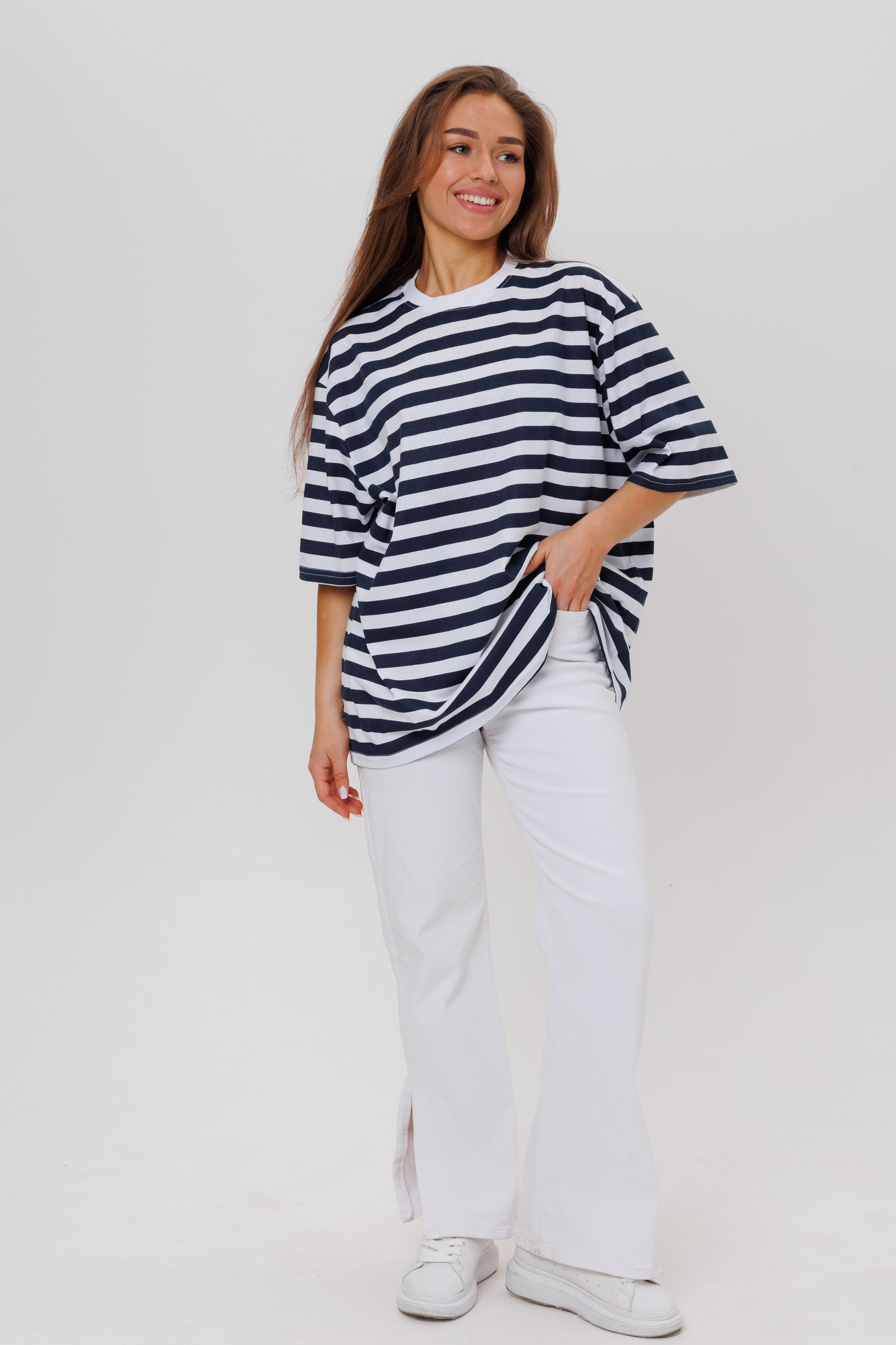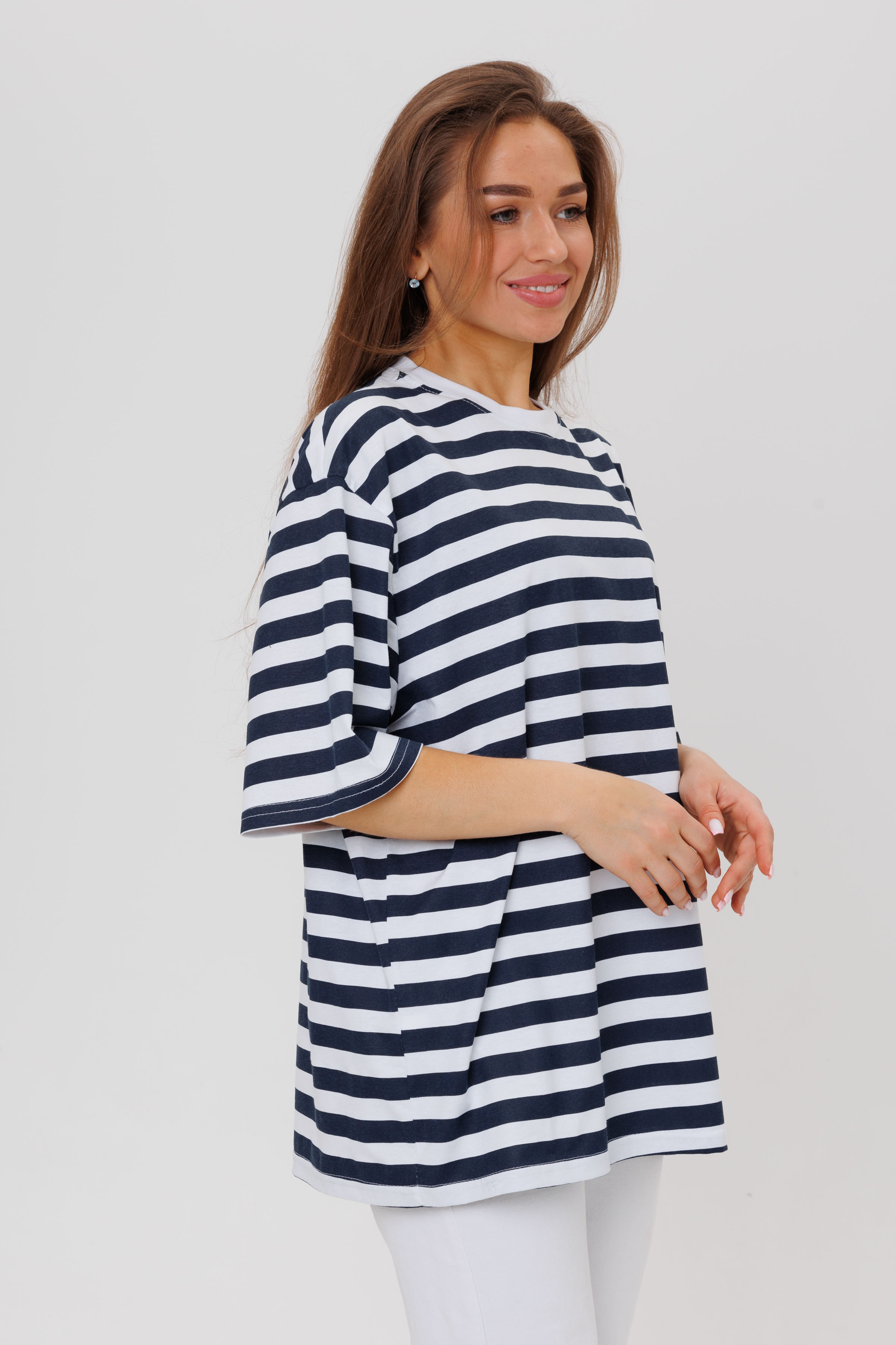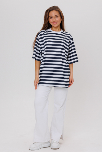 Футболка тельняшка оверсайз (oversize ) женская в полоску со спущенной линией плеча  – это модная стильная базовая модель на каждый день. Она станет идеальным решением для крутого образа на лето – для отпуска, в городе, офисе, на прогулке, на море, на океане, для любых путешествий, как домашняя одежда, для спорта и фитнеса.