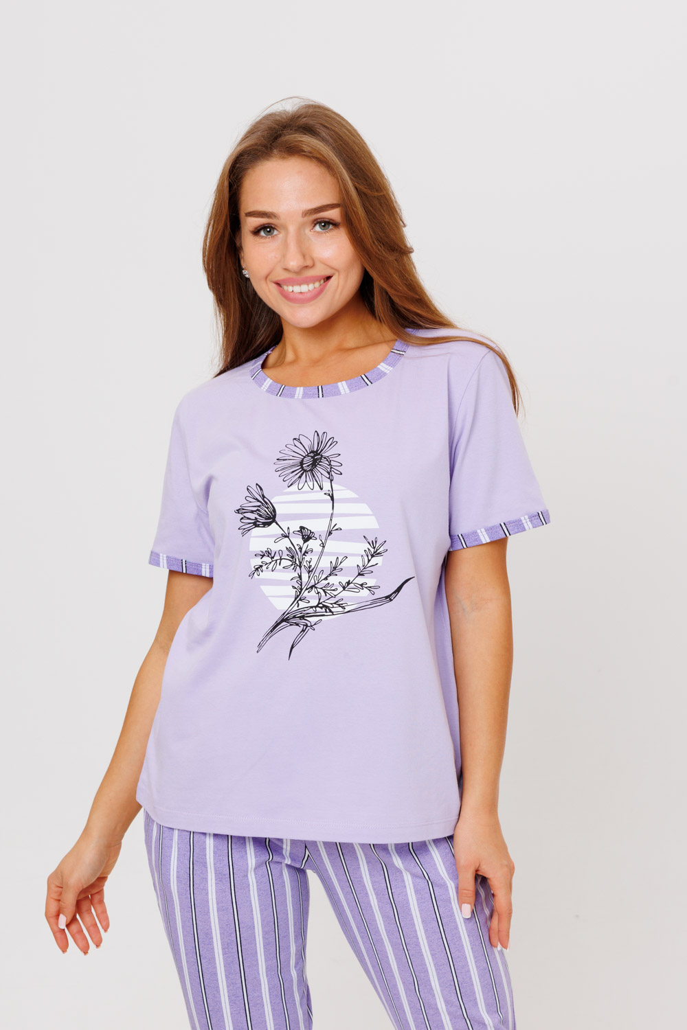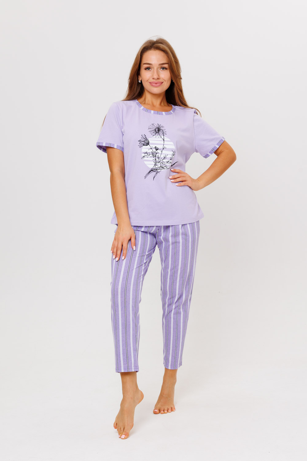 Женский домашний костюм, состоящий из футболки с коротким рукавом и брюк.