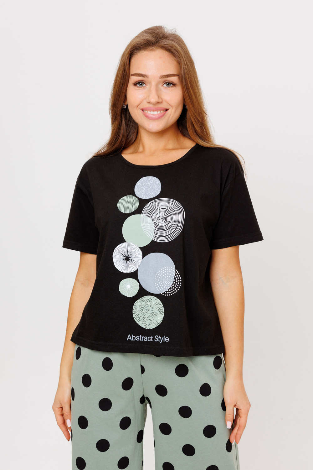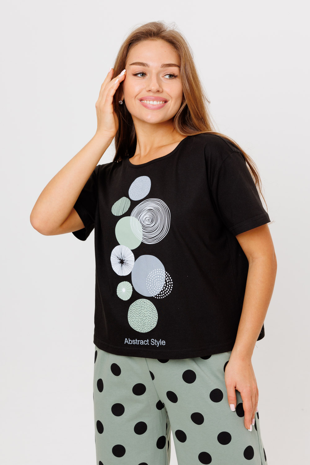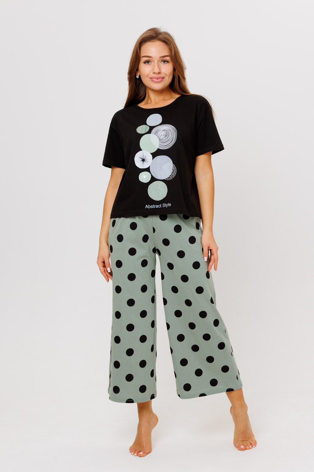 Женский костюм, состоящий из футболки с коротким рукавом и принтом и  свободные брюки с мягкой резинкой и боковыми карманами.