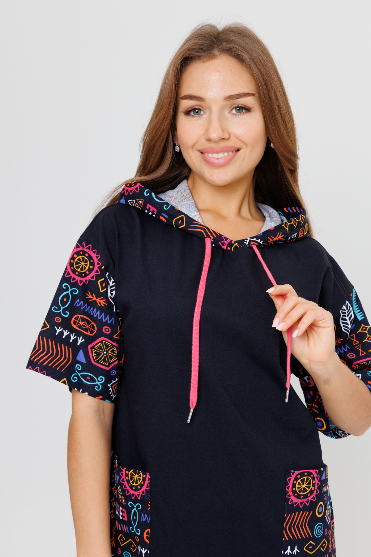 Капюшон, короткие рукава и накладные глубокие карманы выполнены из полотна с яркими рисунками этнического стиля.