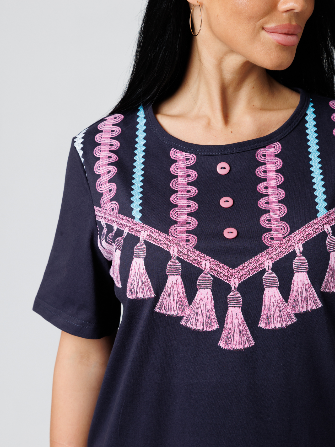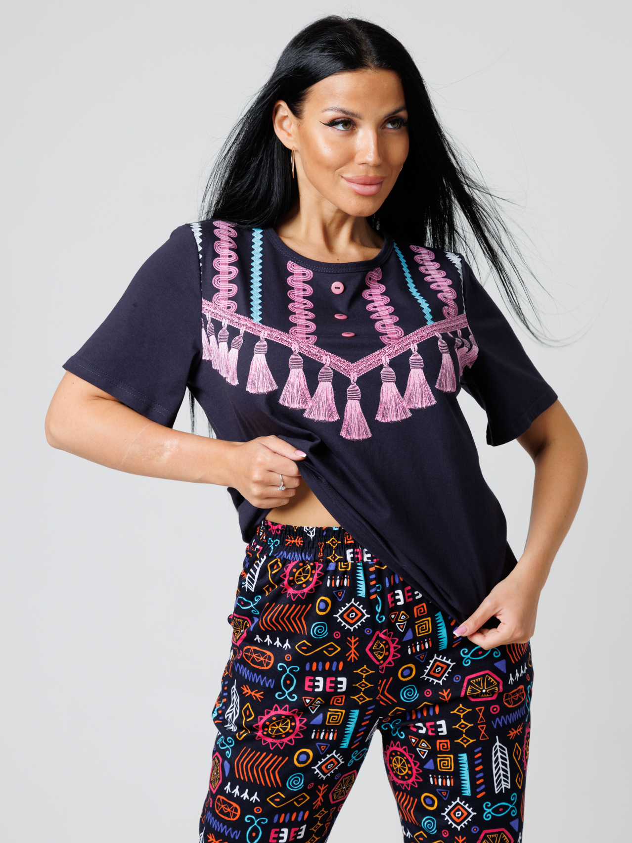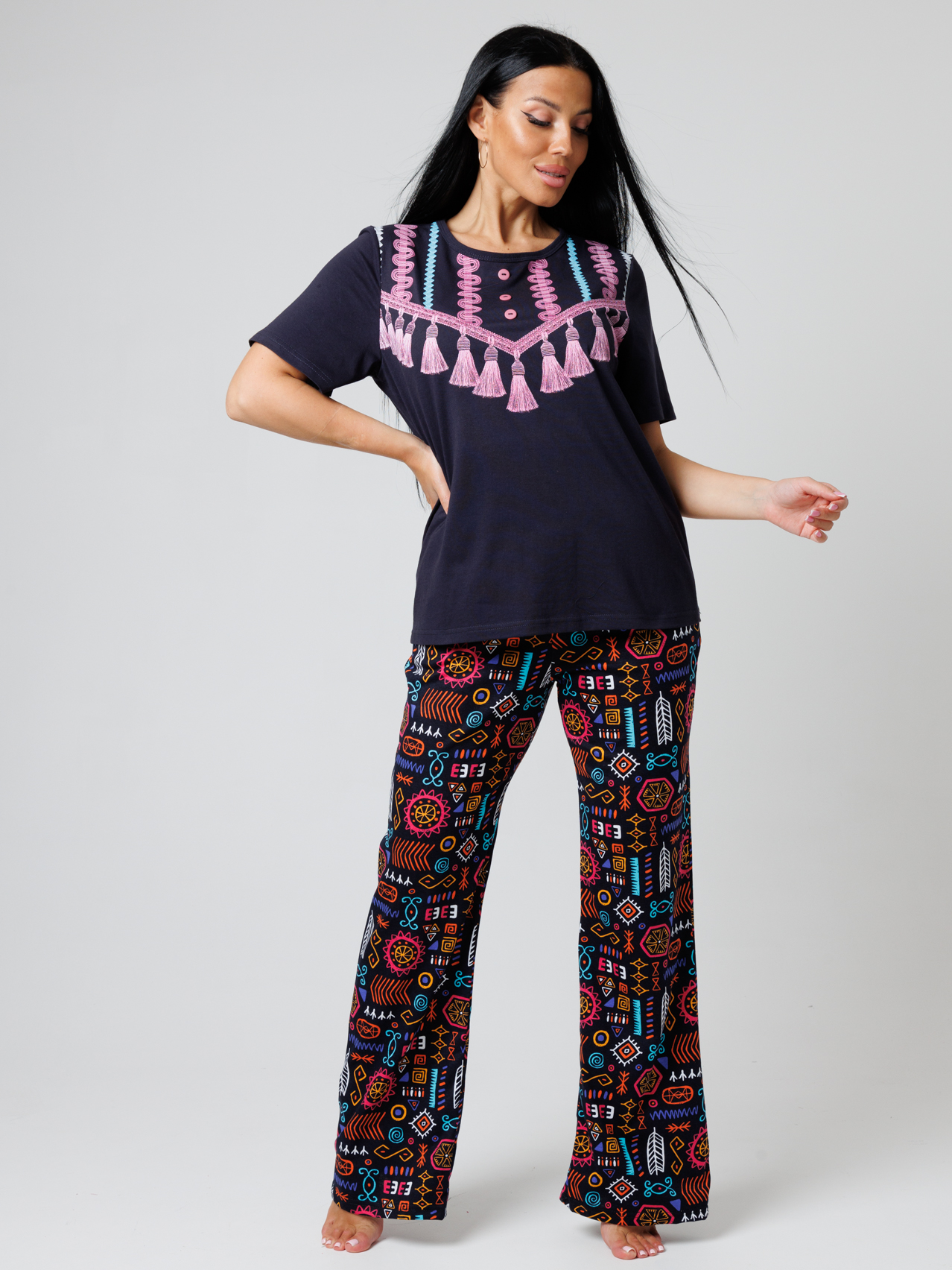 Женский костюм выполнен в этническом стиле и состоит из футболки и брюк.