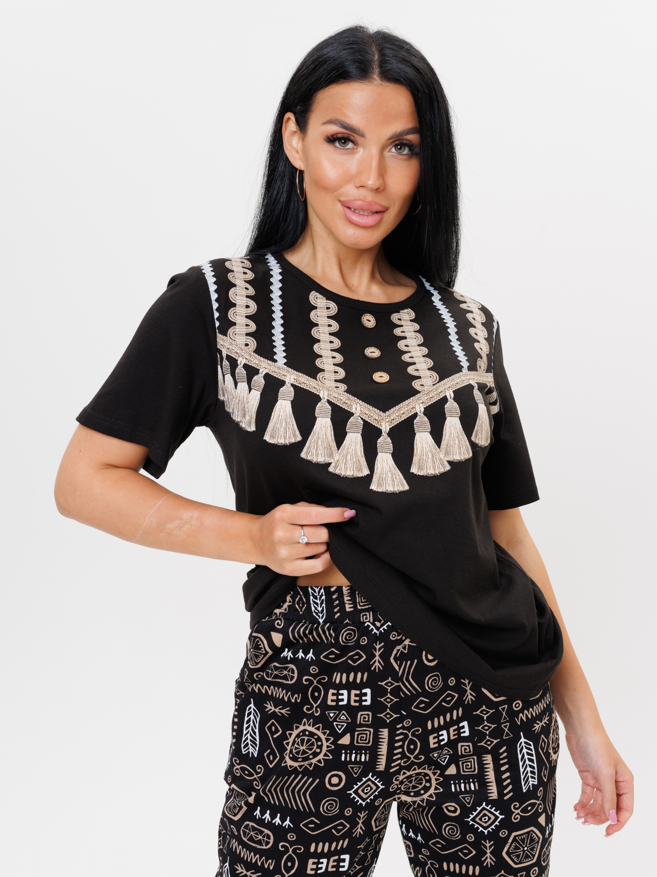 Женский костюм выполнен в этническом стиле и состоит из футболки и брюк.