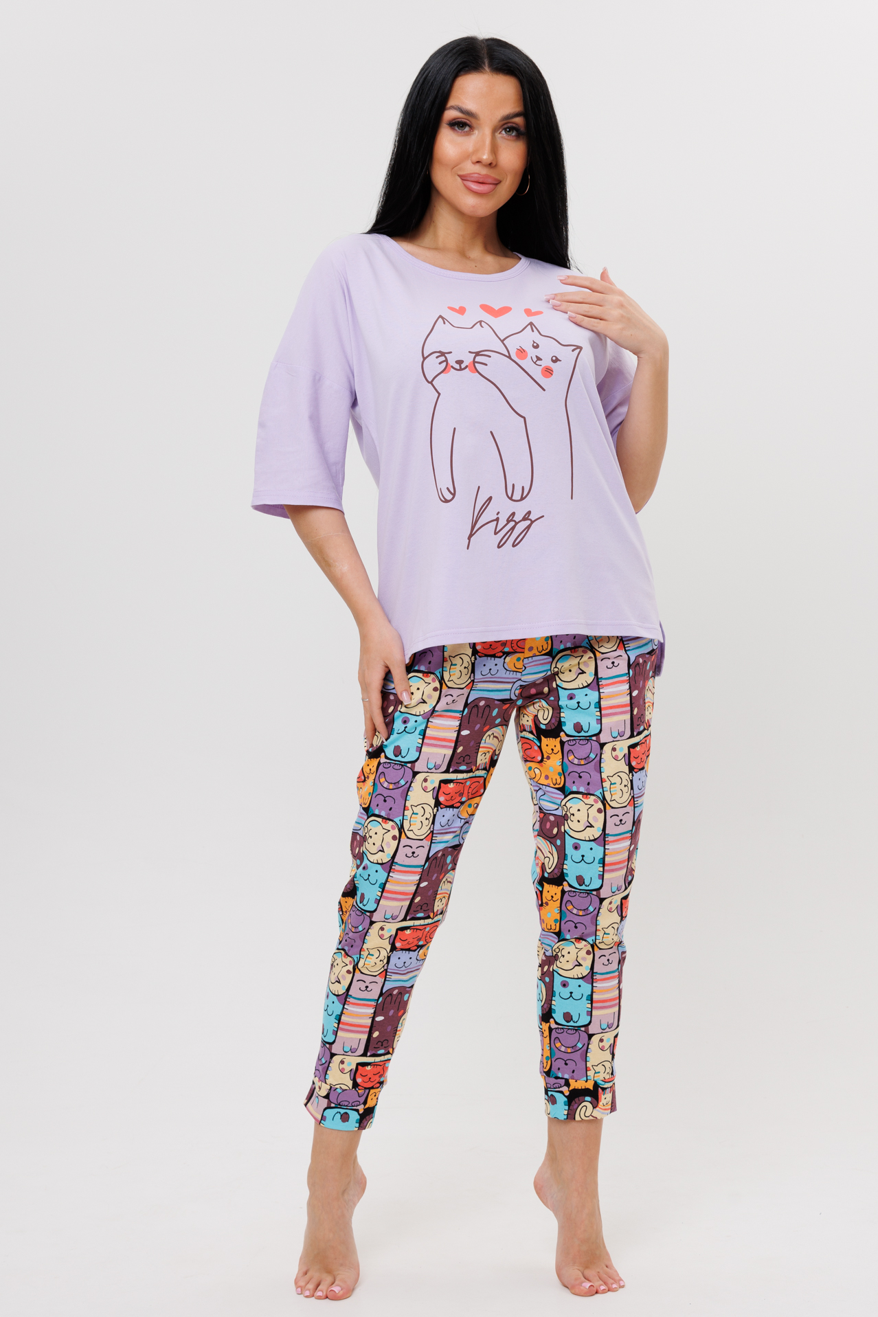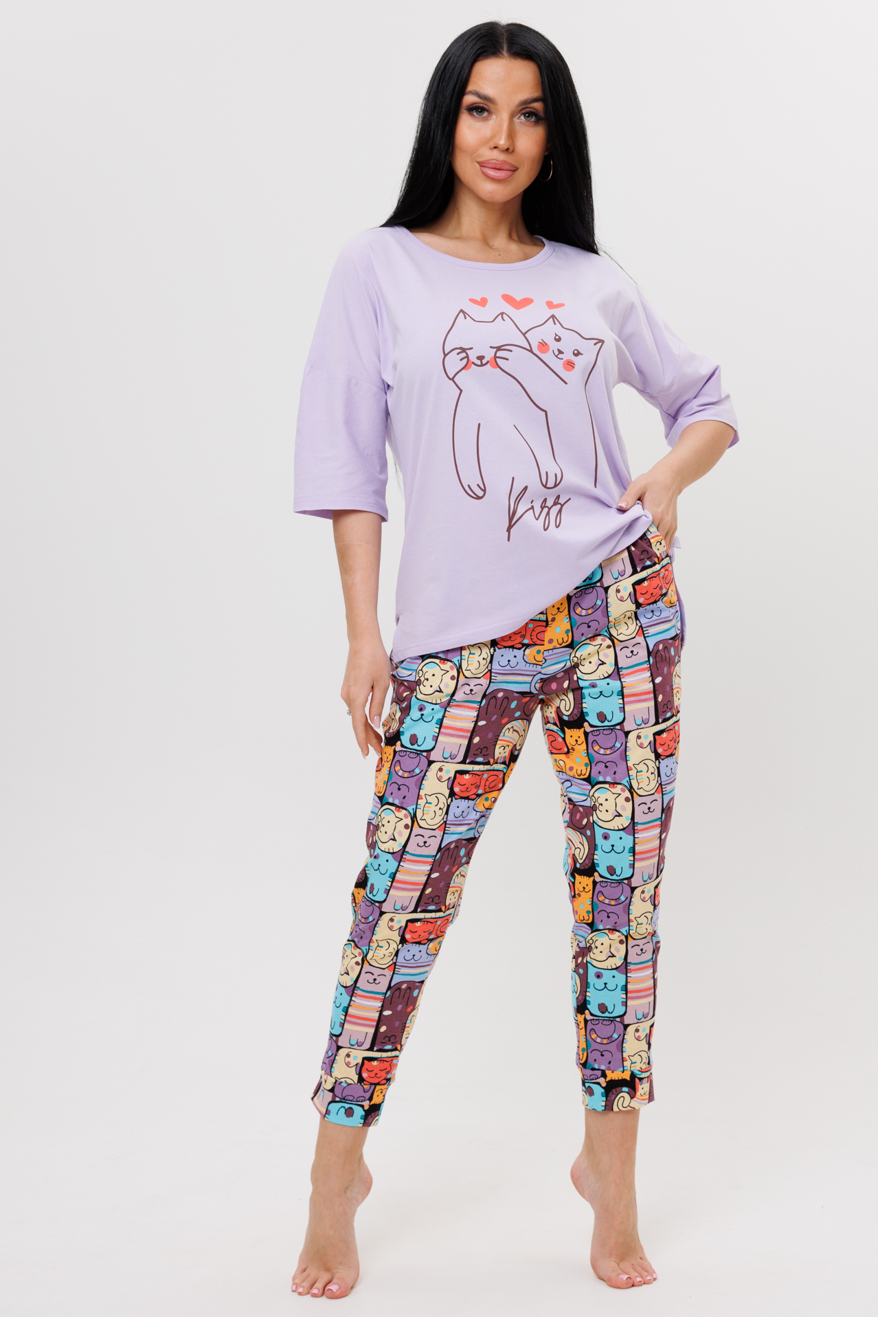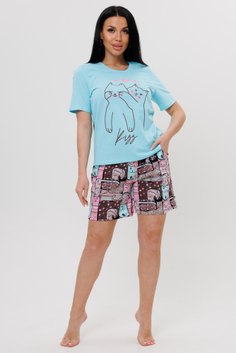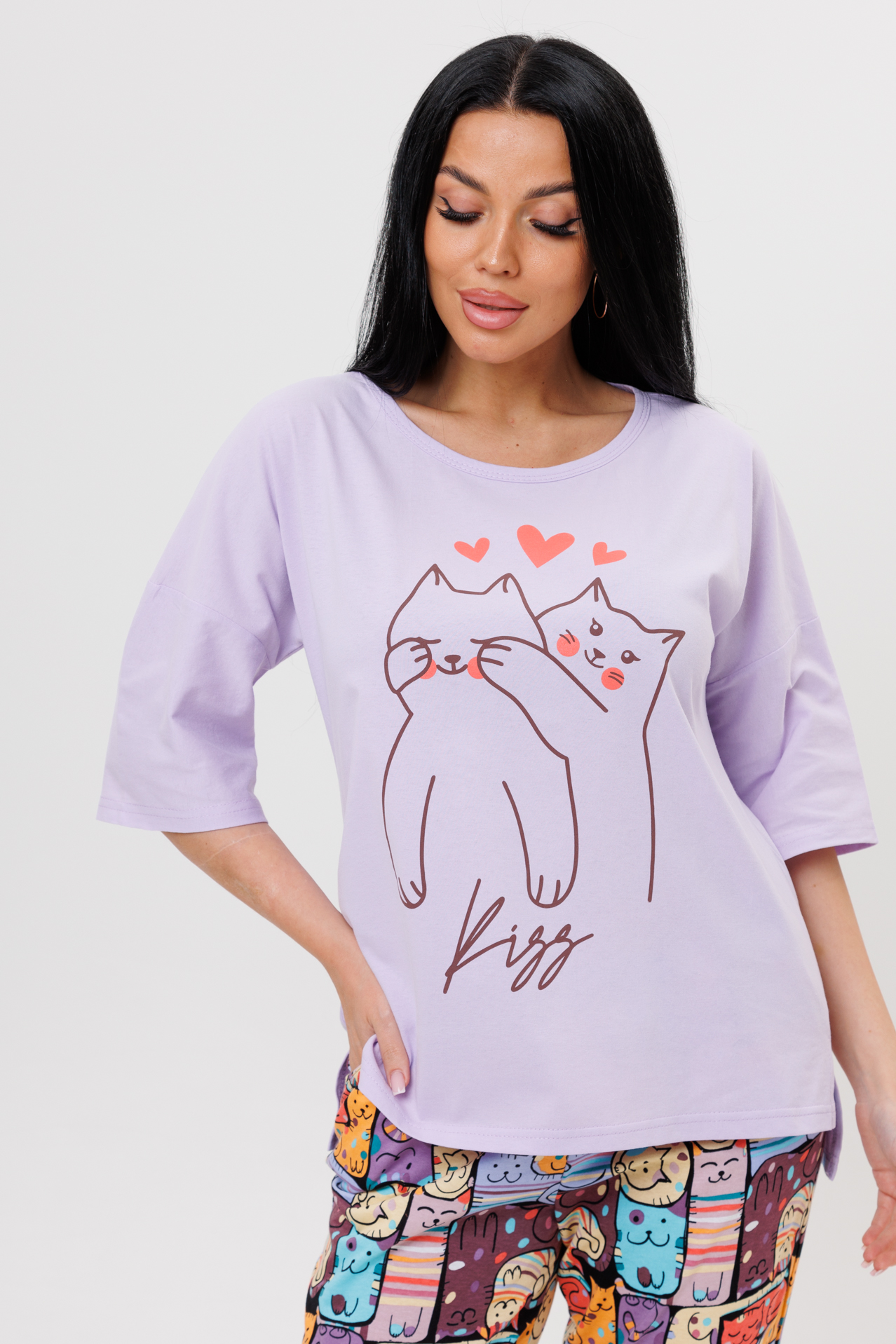 Костюм с брюками сшит из экологичного трикотажного полотна. Ткань максимально мягкая, идеальна круглый год.  Такой костюм с брюками можно использовать не только для носки дома, но и сна. В комплект входят футболка с принтом и брюки из ткани компаньона с оригинальным принтом. Футболка свободного кроя, с круглым вырезом, спущенными рукавами по линии плеча, брюки заужены книзу и отделаны манжетами. Элегантный женский костюм для дома и сна замечательно будет выглядеть  и на полных девушках.