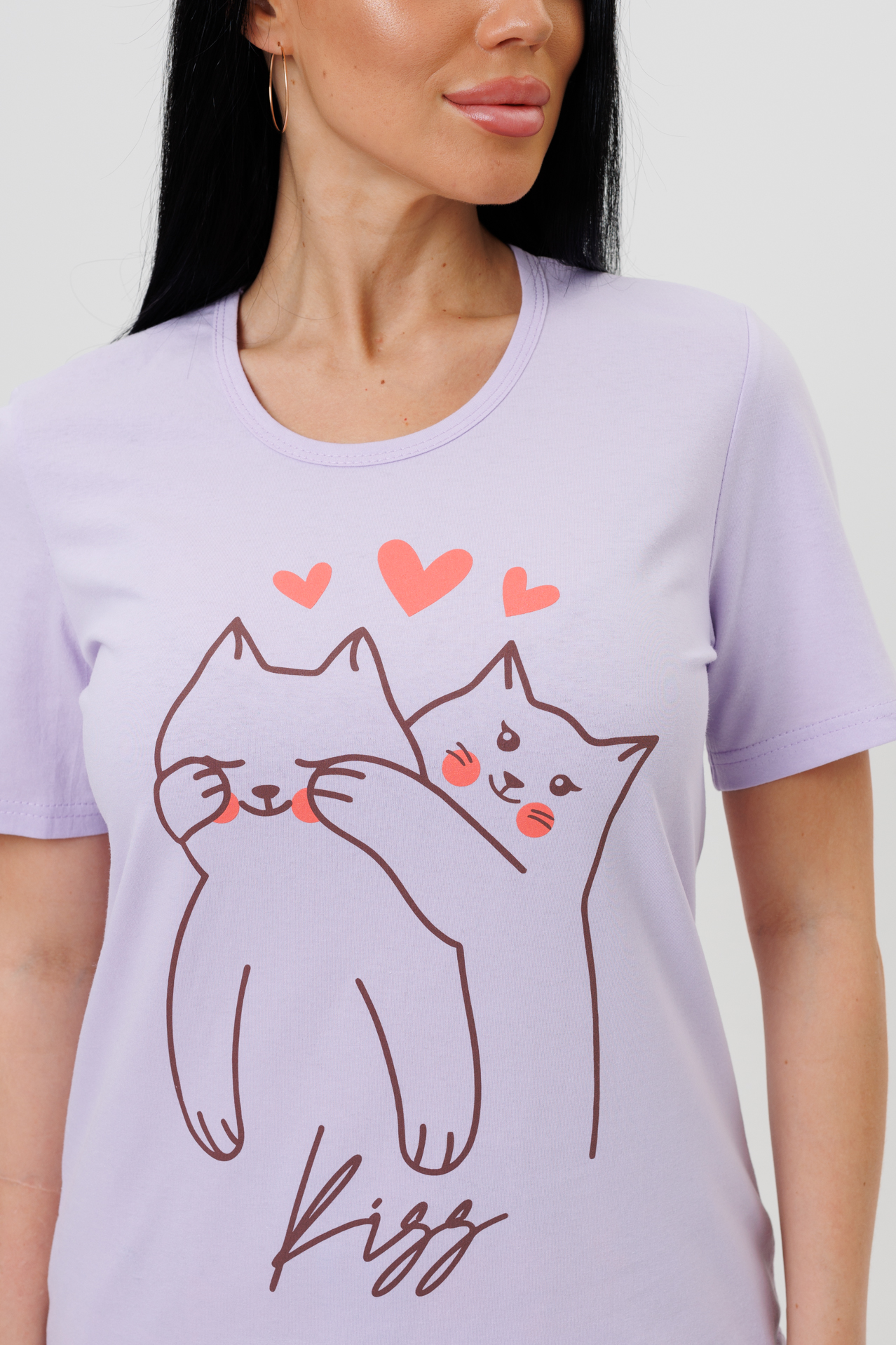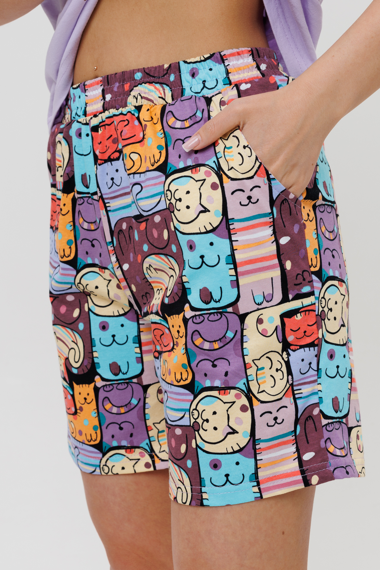 Костюм сшит из трикотажного полотна 100% хлопка. Костюм состоит из футболки и шорт. Футболка с короткими втачанными рукавами и круглым вырезом. Шорты выполнены из ткани компаньона с оригинальным принтом.  Такой костюм с шортами можно использовать не только как комплект для дома, но и сна.