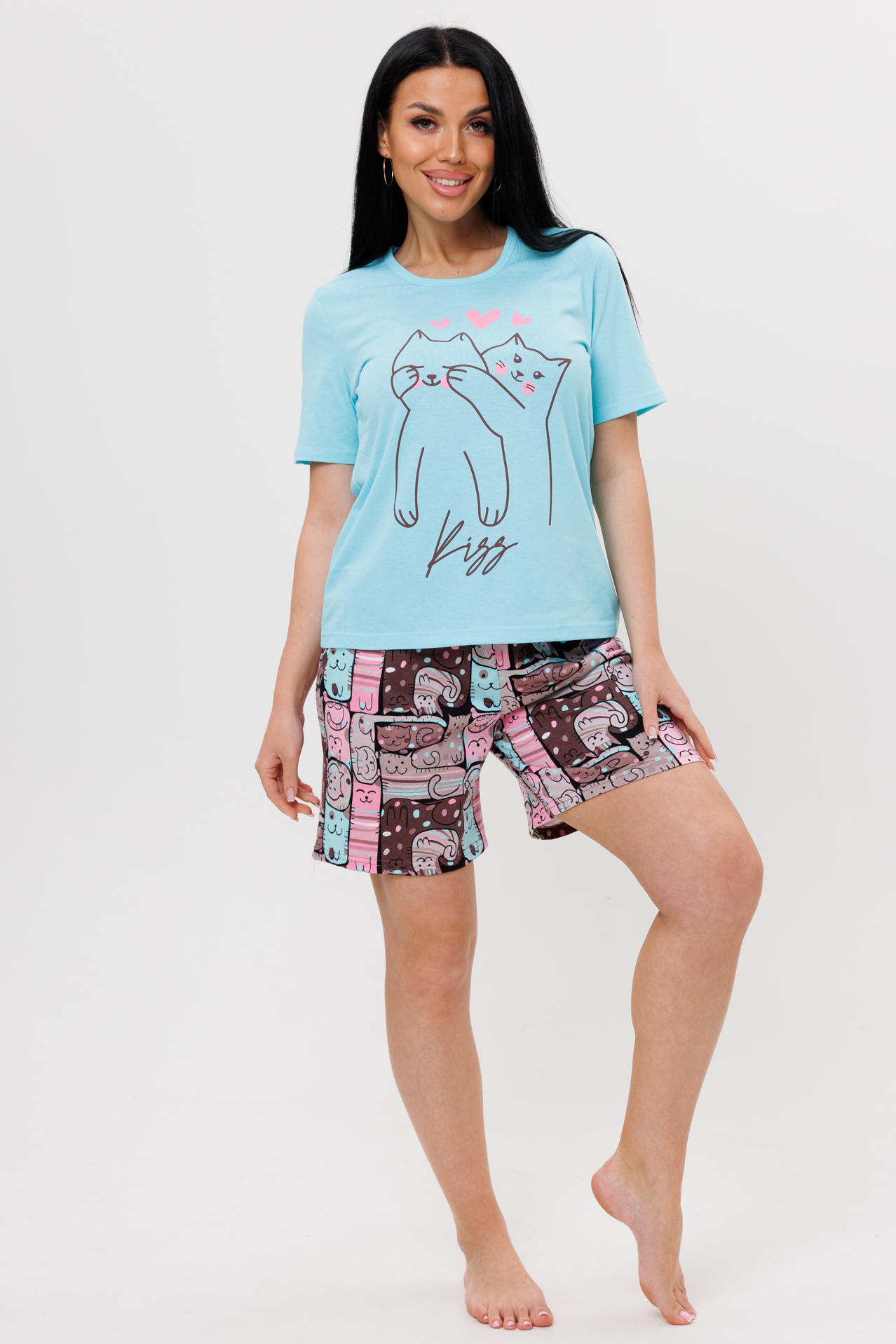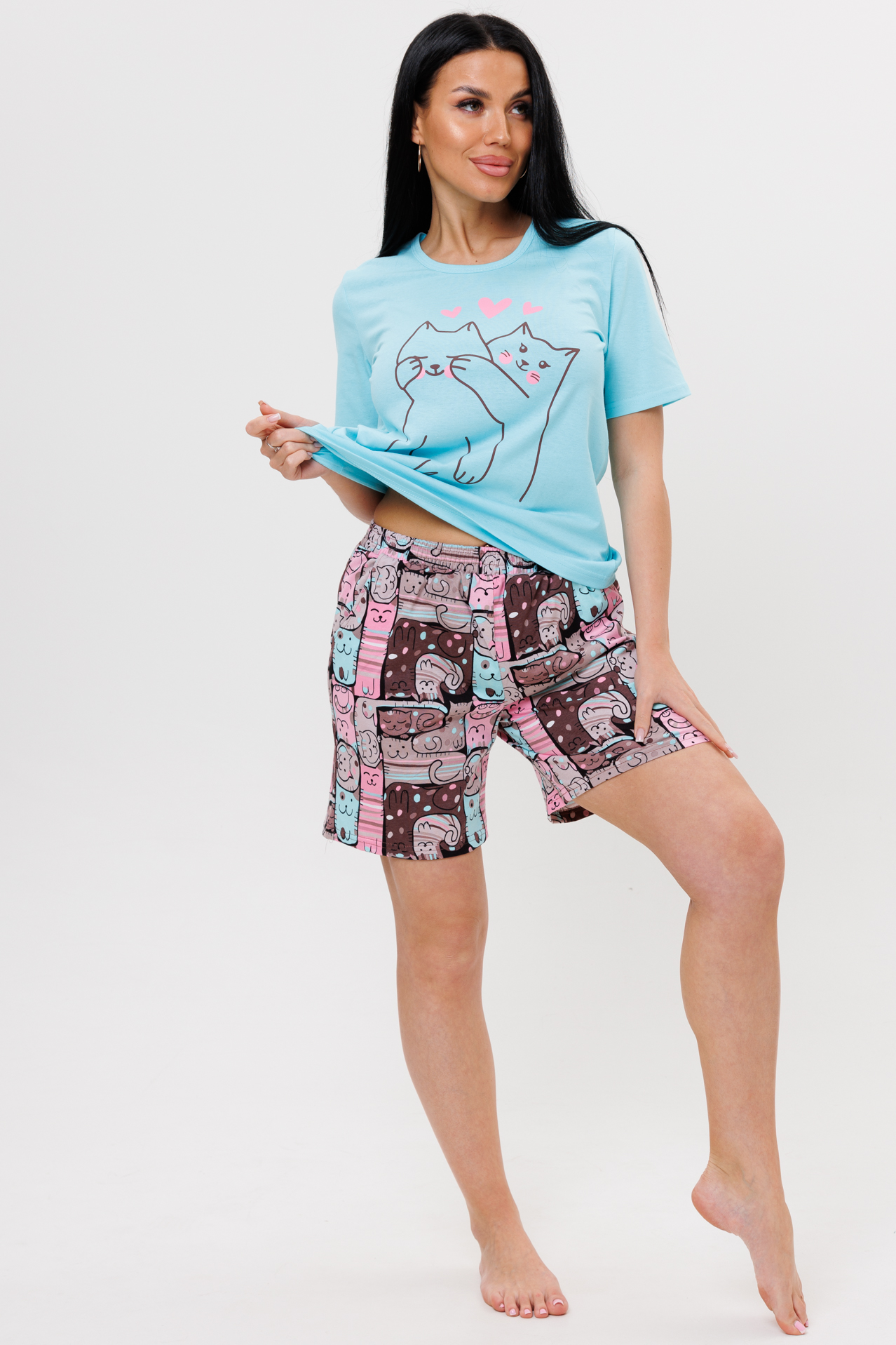 Костюм сшит из трикотажного полотна 100% хлопка. Костюм состоит из футболки и шорт. Футболка с короткими втачанными рукавами и круглым вырезом. Шорты выполнены из ткани компаньона с оригинальным принтом.  Такой костюм с шортами можно использовать не только как комплект для дома, но и сна.