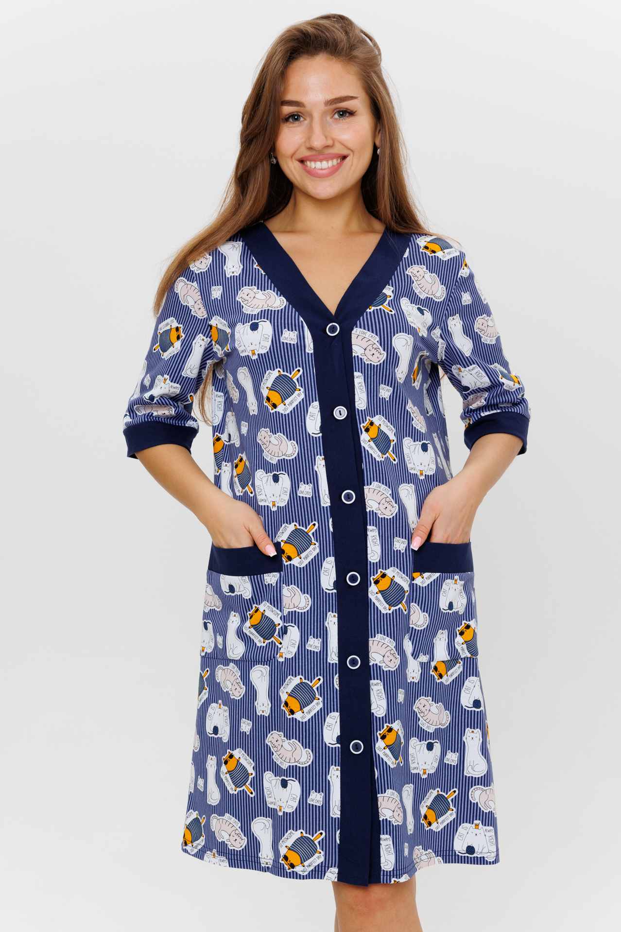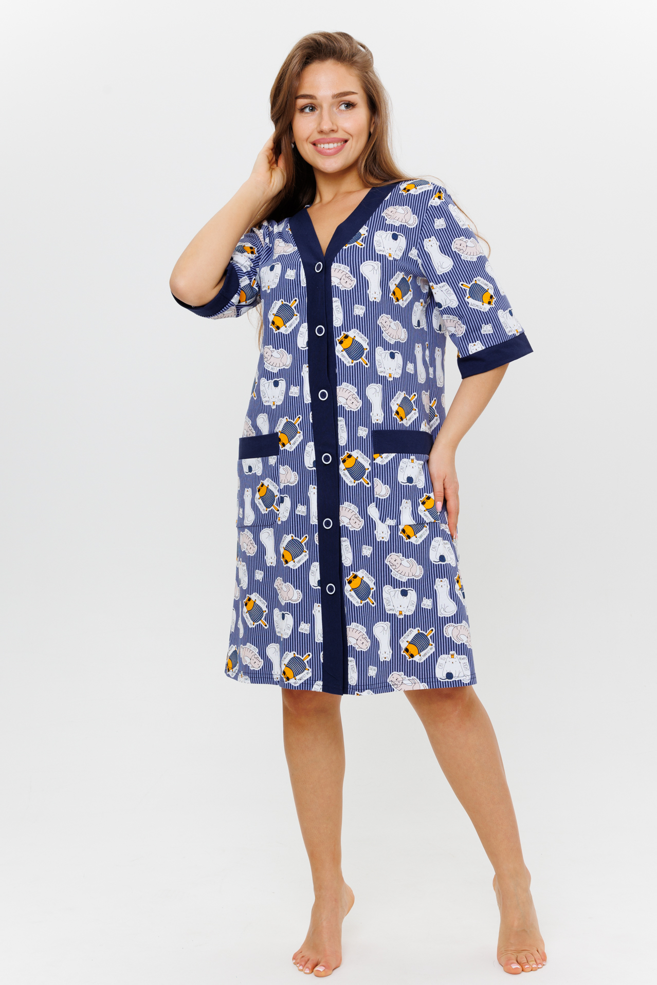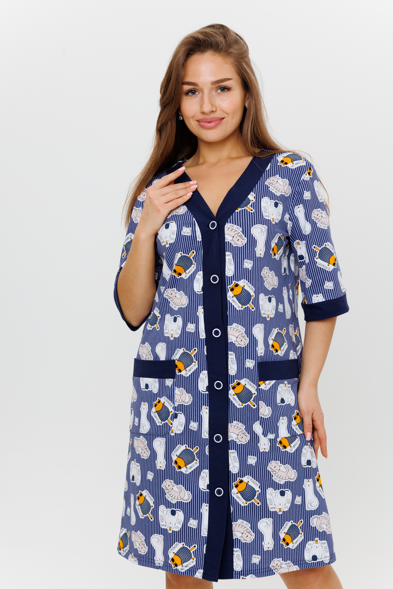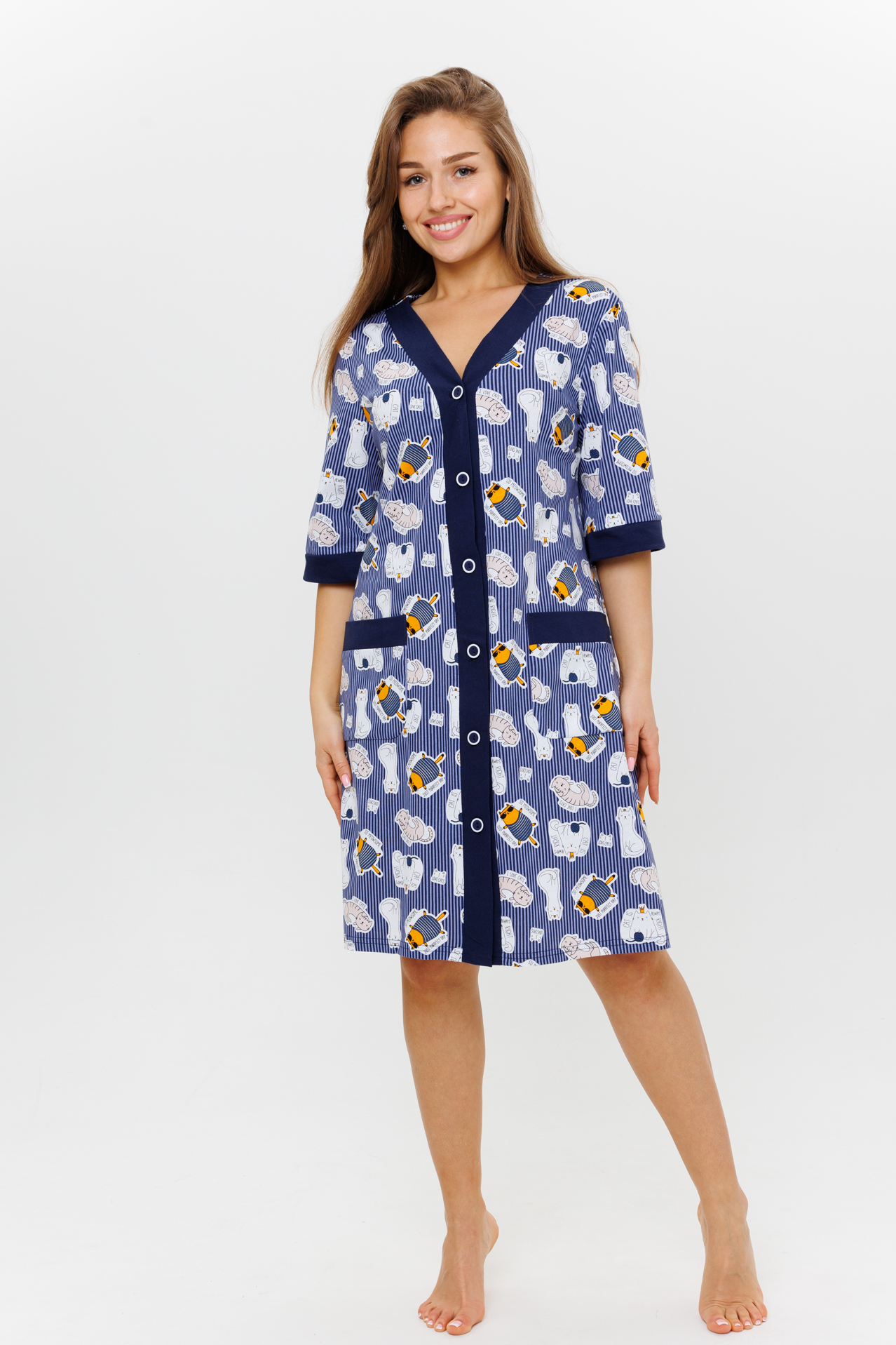 Халат на пуговицах выполнен из трикотажного полотна. Вырез V-образный, втачной рукав чуть ниже локтя, карманы накладные. Планка халата, манжеты рукавов и карманы декорированы тканью компаньоном.