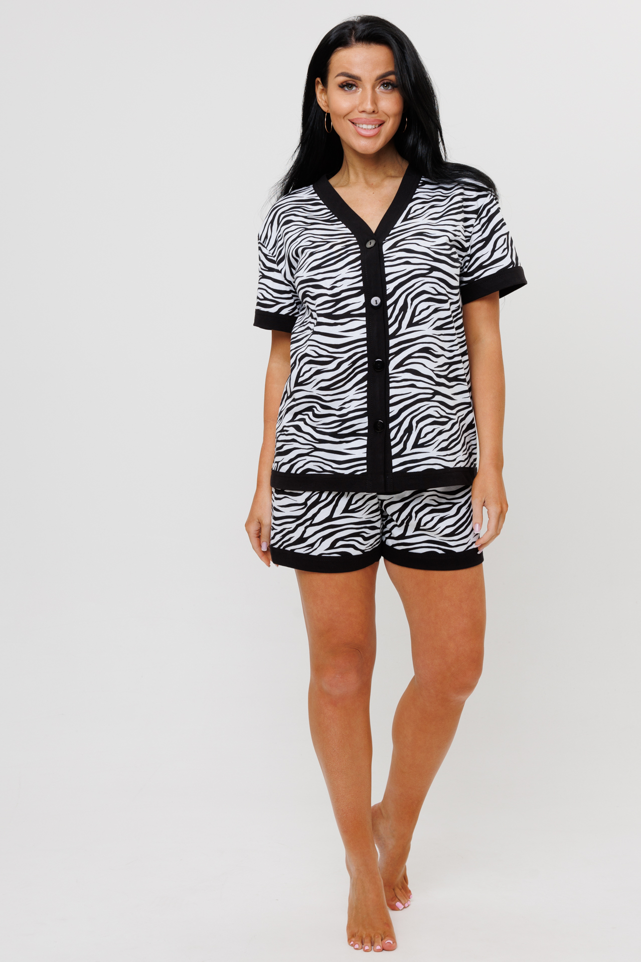 Домашний комплект состоит из рубашки и шорт. Свободная рубашка на пуговицах с V-образным вырезом отделана тканью компаньонам. Короткий рукав подчеркивает манжета из ткани компаньона. Шорты с манжетами на эластичной резинке. Домашний комплекс можно использовать как пижаму и как домашний костюм.