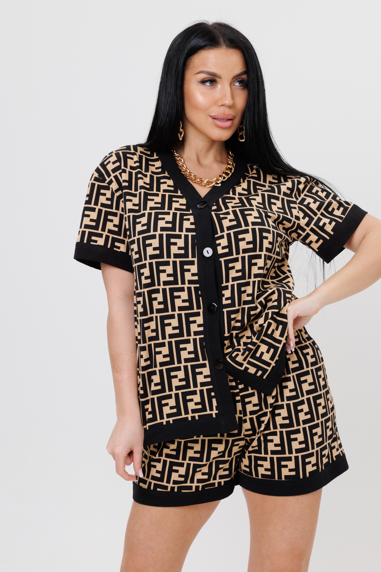 Домашний комплект состоит из рубашки и шорт. Свободная рубашка на пуговицах с V-образным вырезом отделана тканью компаньонам. Короткий рукав подчеркивает манжета из ткани компаньона. Шорты с манжетами на эластичной резинке. Домашний комплекс можно использовать как пижаму и как домашний костюм.