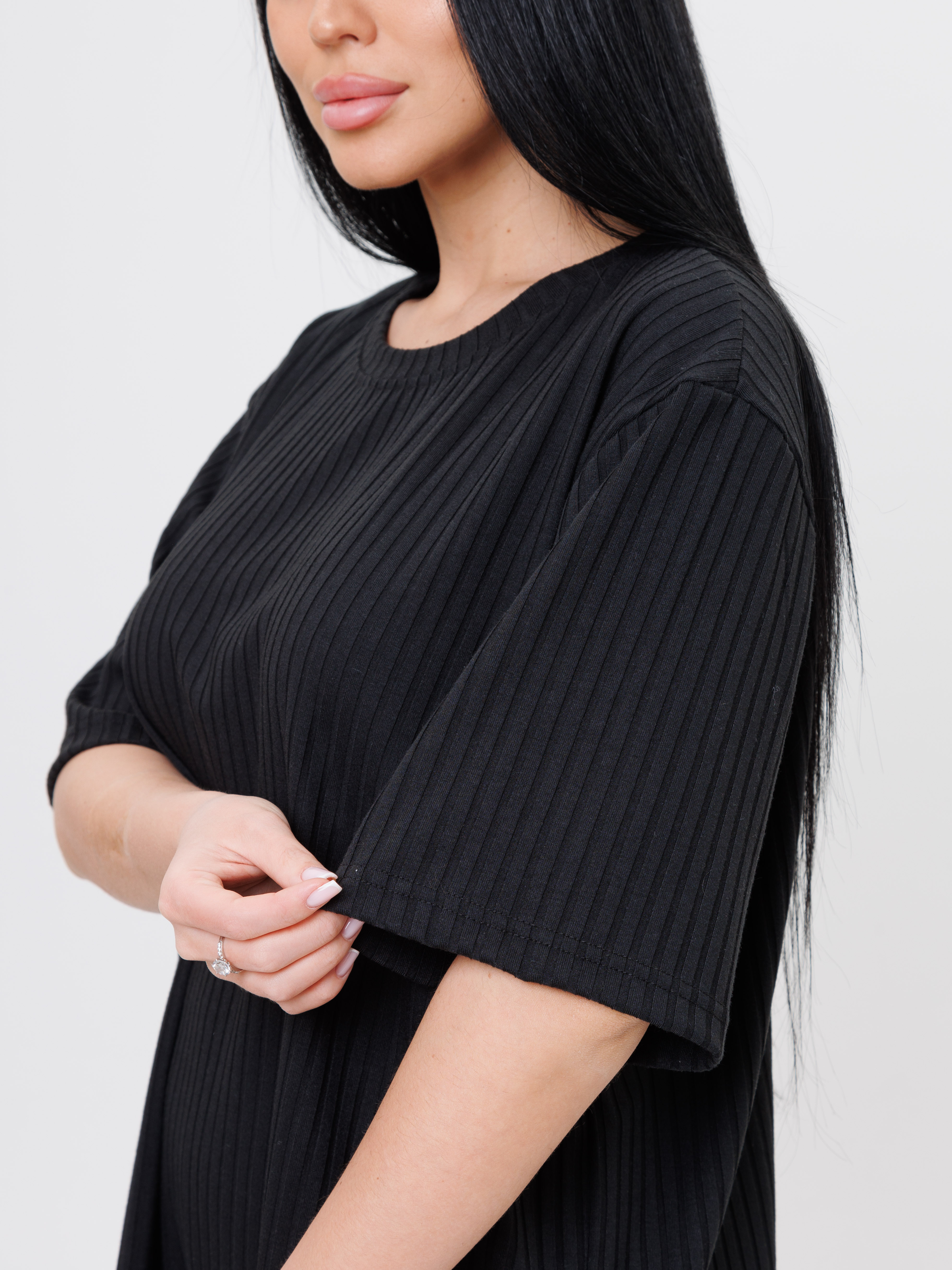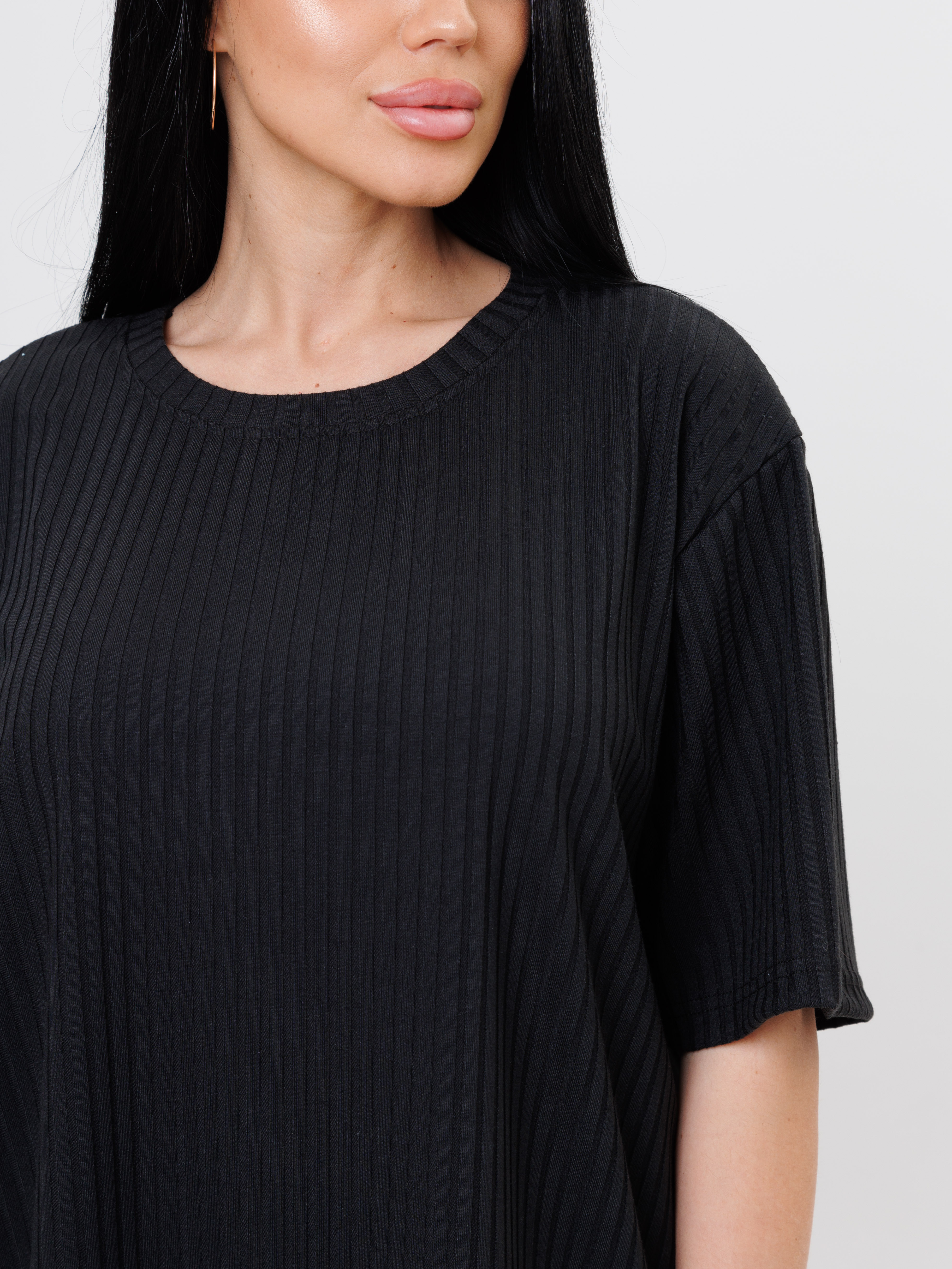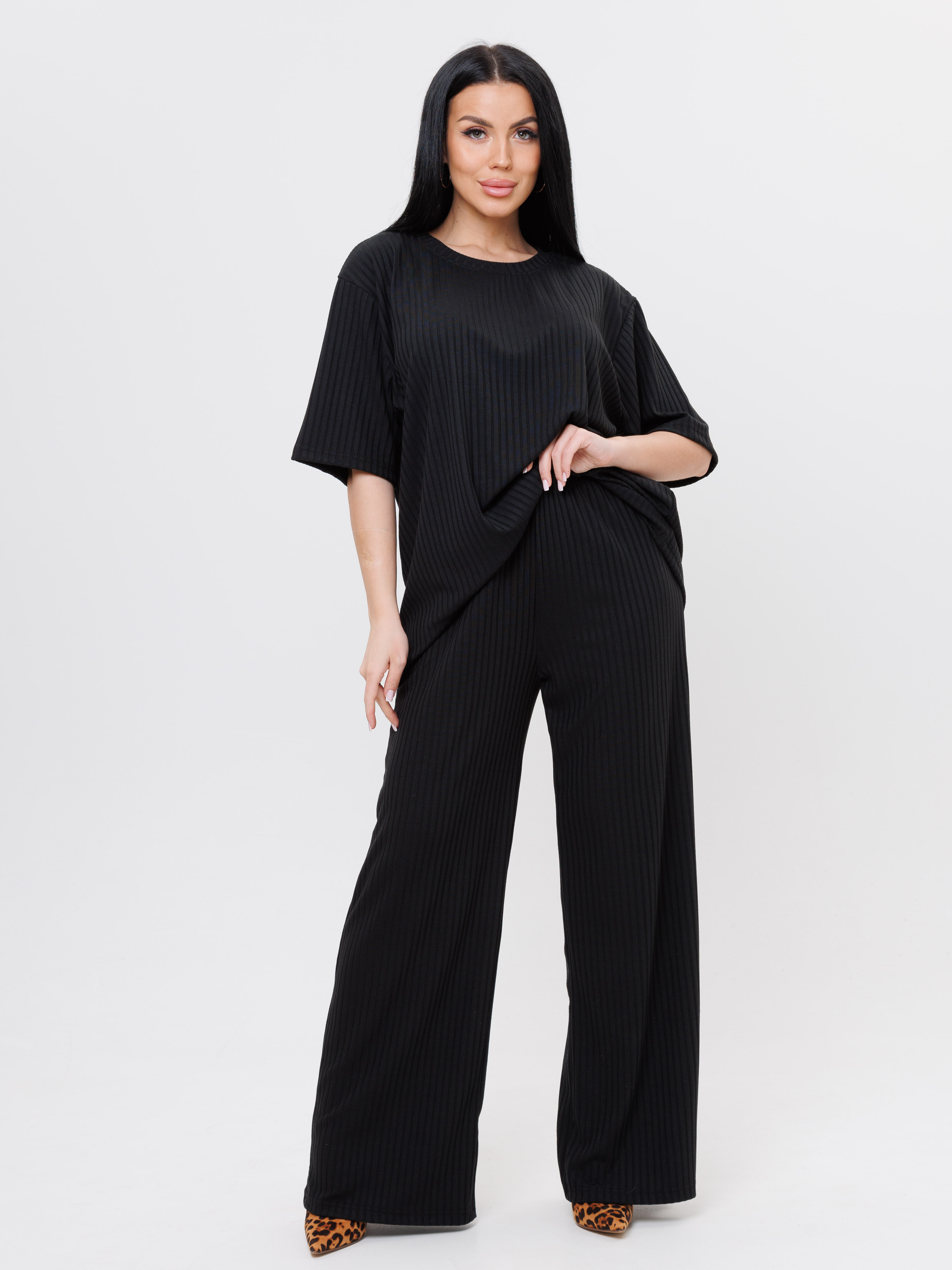 Стильный и удобный брючный костюм сочетает в себе модный стиль, элегантность и комфорт. Костюм состоит из брюк и кофты сшитых из мягкой и эластичной трикотажной ткани лапша. Брюки свободного покроя на эластичной резинке. Кофта с короткими рукавами со спущенной линией плеча и круглым вырезом. Костюм оверсайз подойдет для повседневного, делового и праздничного образов.
